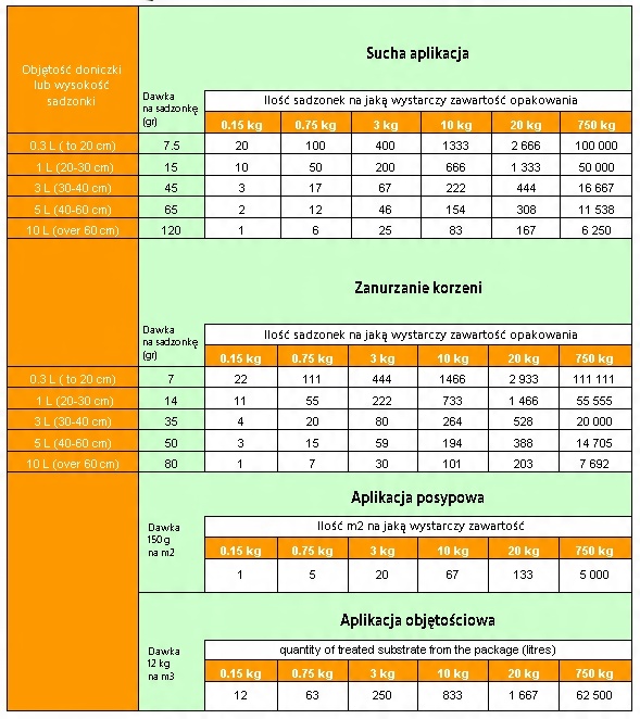 Найпопулярнішим способом застосування є приготування суспензії. в якій ми замочуємо коріння рослин перед посадкою, це також найефективніший метод, оскільки ми ретельно покриваємо всю поверхню коренів, даючи мікоризі можливість негайно розвиватися. Для цього приготуйте суспензію, заливши вміст упаковки відповідною кількістю води. Також можна посипати рослину в лунки перед посадкою, на дно горщика або в підготовлені борозенки в кореневій системі рослини (15 грам на об'єм 1 літра кореневої системи). Перед посівом 15 грам/кв. У існуючих садах, виноградниках або ягідниках можливе механічне глибоке внесення за допомогою розкидача або ручне внесення в лунки кореневої системи.