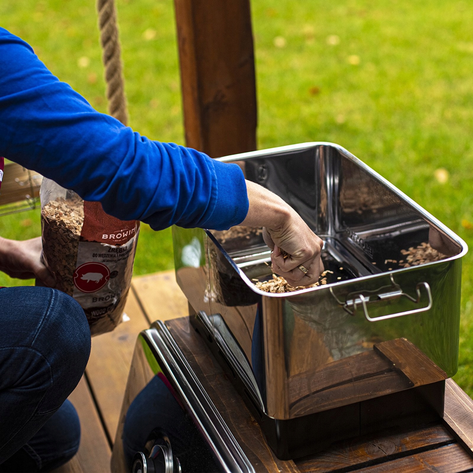 Процес копчення вимагає використання коптильної стружки. Ми рекомендуємо додати приблизно 60 - 80 г деревної стружки (дві великі жмені), що дозволить уникнути надмірного підкислення страви.
