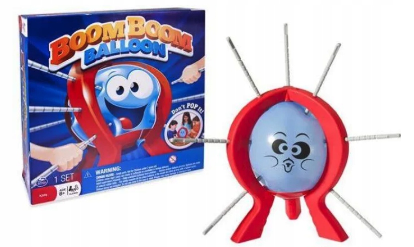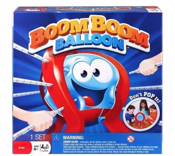 Boom Boom Ballon — весела та захоплююча гра, яка сподобається дітям. У коробці підставка, кубик, повітряна кулька та палички. Діти повинні надути повітряну кульку, а потім покласти її на підготовлене місце. Пора починати гру. Кожен гравець по черзі кидає кубик і натискає паличкою на повітряну кульку стільки разів, скільки показано на кубику. З кожним наступним гравцем зростає ризик того, що куля лопне, і той, хто зробить бум, вибуває. Гра викликає у дітей масу емоцій і гарантує чудову розвагу.