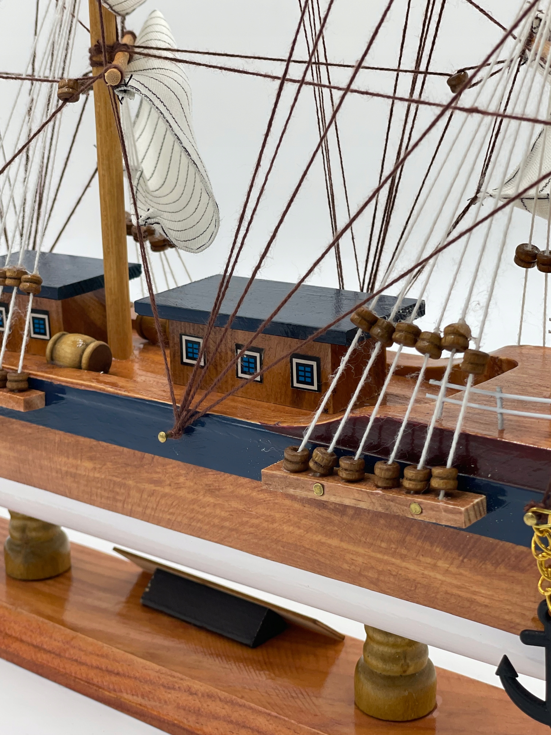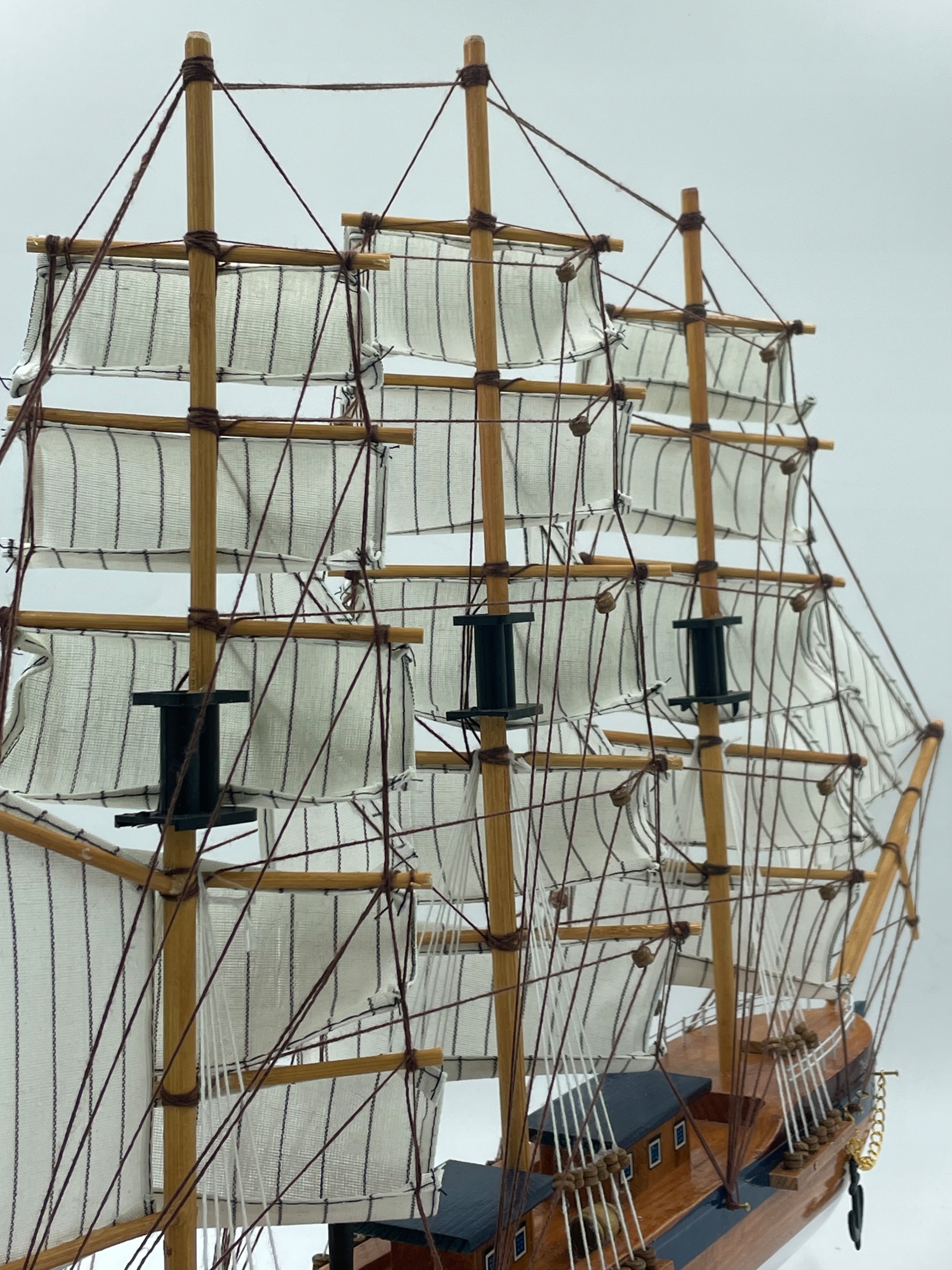 Зважаючи на розміри вітрильника, після покупки вам необхідно встановити бушприт (передня балка) на дузі) самостійно. Вставте його в отвір. Це не повинно бути проблемою. Вставивши бушприт, тягнемо такелаж бушприта з лівого і правого боків і посередині, на кінці троса є гачки, якими ми зачіпляємо якірний ланцюг зліва і справа від корпусу.