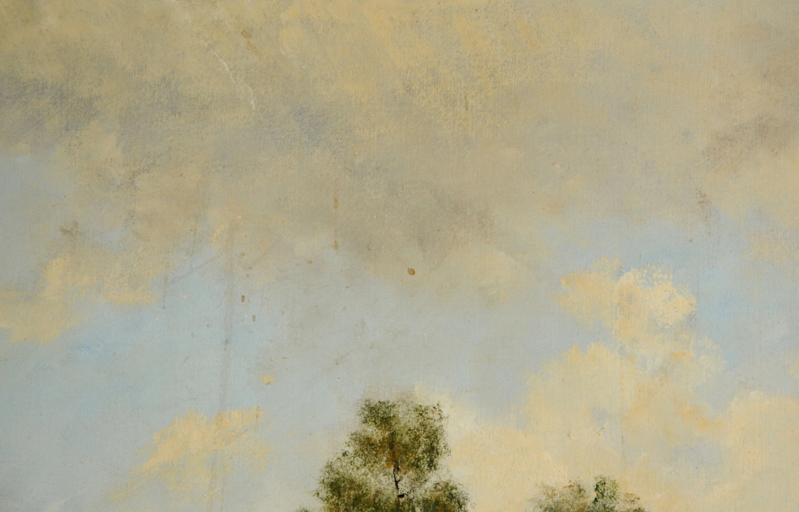 - На картині є трохи бруду на полотні (плями та вертикальні лінії видно на небі) - фото 9 і 10 великим планом) !! !