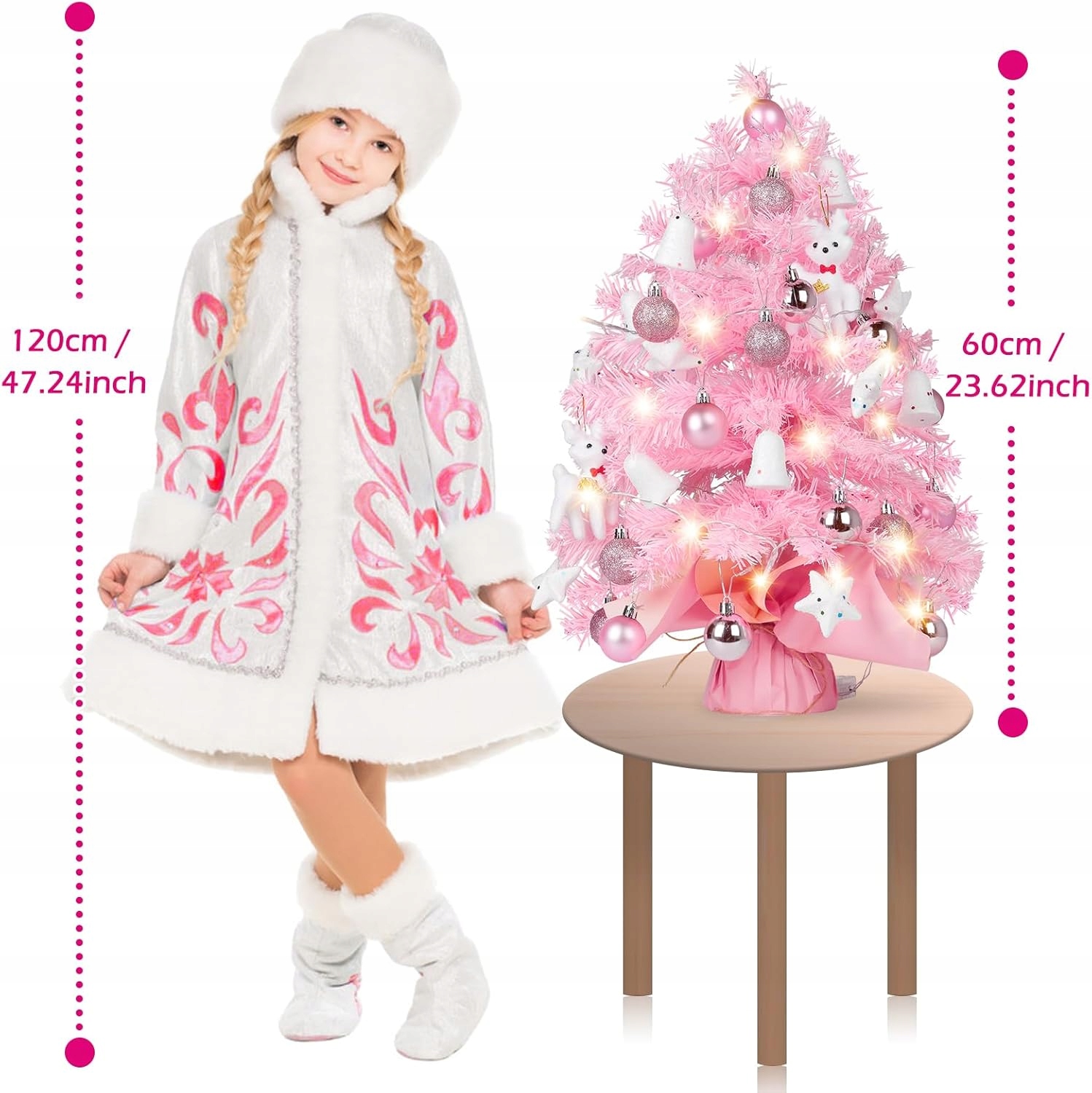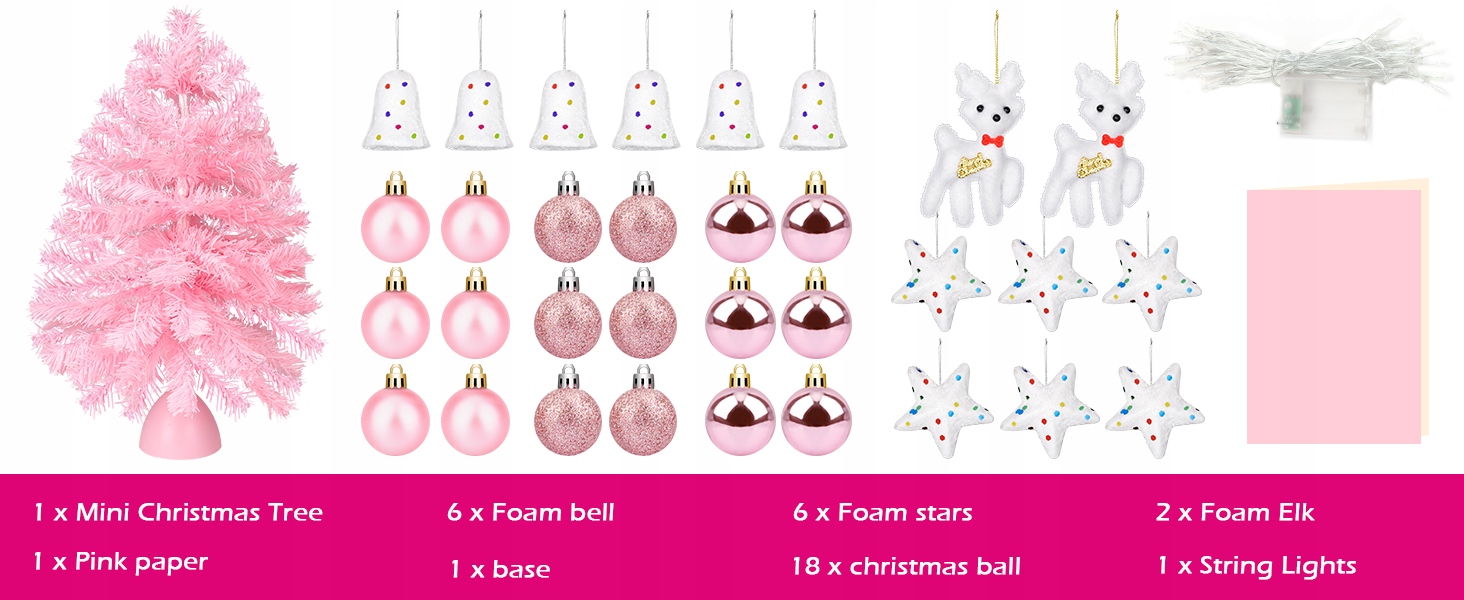 - Різдвяний стіл своїми руками: ви отримаєте маленьку рожеву ялинку розміром 60 см (з 65 кінчиками гілок), 1 шт., 30 світлодіодних ниток, 1 шт. силіконової основи та 1 шт. рожевого паперу (з ниткою), 18 шт. ялинкових кульок, 6 шт. пінопластових дзвіночків, 6 шт. пінопластових зірочок, 2 шт. поролоновий лось. Ви можете побудувати унікальне дерево.