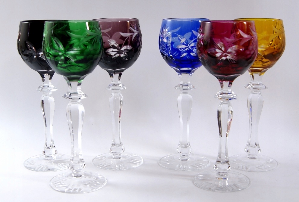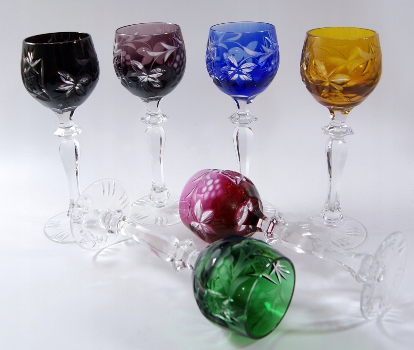 Красиві, старі окуляри - набір з 6 штук, оригінальні рерієри, виготовлені з барвистого, шаруватого кришталевого скла.