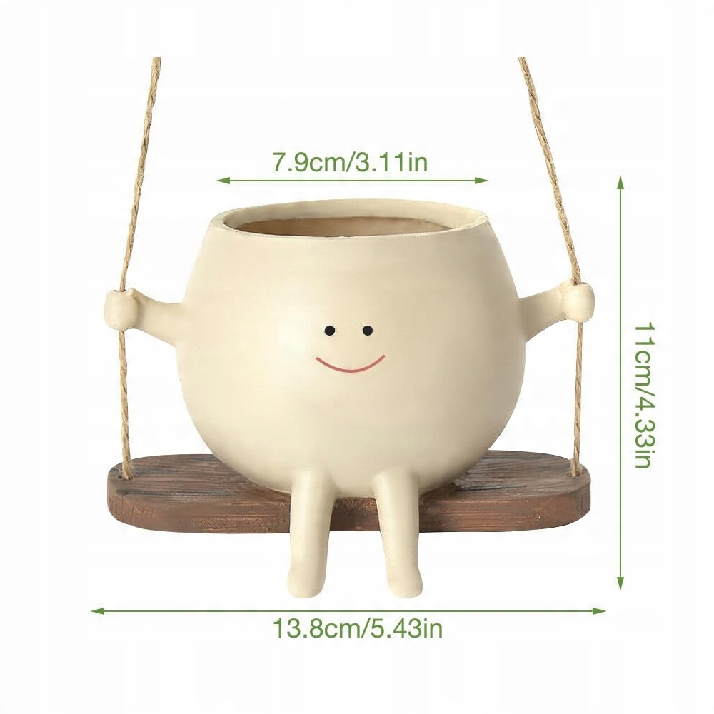 🌿😊【Унікальний дизайн】Зовнішній вигляд підвісного вазона дуже унікальний, він нагадує дитину, яка гойдається вперед-назад на гойдалці з яскравою посмішкою. Стельові квіткові горщики викликають інтерес у дітей, їх можна розміщувати в садах або на подвір’ях, створюючи гарний ландшафт.