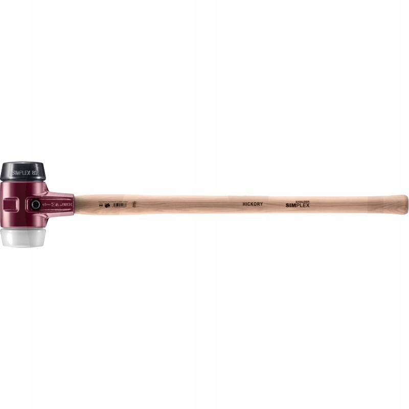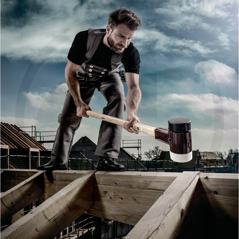 Версія:: простий молоток з м'якою поверхнею в комбінованій вставці - гумова композиція (чорна, середньої жорсткості, демпфування, без запаху, низький стирання) / суперпластик (білий, середньої жорсткості, дуже міцний). Корпус із ковкого чавуну з інтегрованою захисною манжетою ручки та високою стійкістю до пошкоджень. Довговолокниста, дуже міцна ручка з гікорі, лакована та ергономічної форми. Усі деталі можна замінити/модернізувати, що робить їх дуже економічними та ресурсозберігаючими.