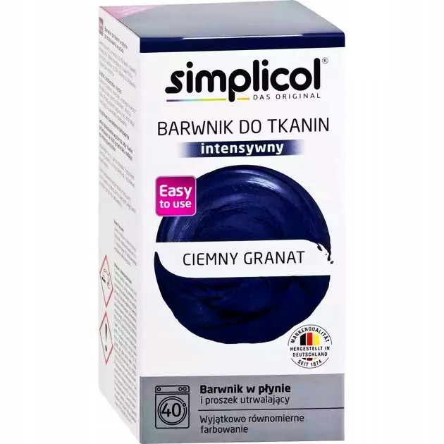 Ефект видно відразу - красиво пофарбований одяг! Рідкий барвник для використання в пральних машинах, а також в пральних машинах з сучасною системою водозбереження. Інтенсивний барвник Simplicol призначений для всіх тканин з бавовни, віскози, льону, а також змішаних тканин. Барвник швидко розчиняється, рівномірно фарбуючи тканини. Безпечний для пральних машин і тканин. Надайте своєму одязі та тканинам (текстилю) довговічні, виразні кольори - тепер ви можете легко зробити це в пральній машині.
