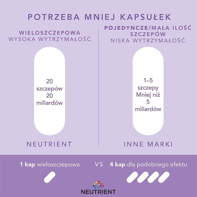 НАЙВАЖЛИВІШІ ХАРАКТЕРИСТИКИ NEU BIOTIC: - наявність 20 живих штамів бактерій, що забезпечують 20 мільярдів КУО (КУО - колонієутворююча одиниця), які природно зустрічаються в мікробіомі кишечника - 5 різних штамів Bifidobacterium і 13 різних штамів Lactobacillus - Додатково доповнений Streptococcus thermophilus і Enterococcus faecium - Оболонка капсули стійка до шлункової кислоти, тому вивільняє живі бактерії тільки в кишечнику. - FOS (фруктоолігосахариди) та інулін є легкодоступним джерелом їжі для корисних бактерій