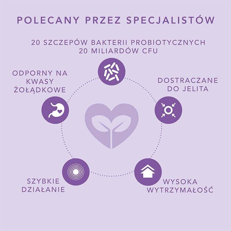 - Інгредієнти:: Запатентована бактеріальна суміш (Bifidobacterium (B. bifidum, B. breve, B. infantis, B. lactis, B. longum), Lactobacillus (L. acidophilus, L. bulgaricus, L. casei, L. crispatus, L. gasseri, L. paracasei, L. plantarum, L. reuteri, L. rhamnosus, L.jensii, L. fermentum, L. lactis, L. salivarius), Enterococcus facecium, Streptococcus thermophilus), інулін*, фруктоолігосахариди (ФОС), магнієві солі жирних кислот (антизлежувач**). Оболонка капсули: гідроксипропілметилцелюлоза. * сертифіковане органічне ** рослинне джерело