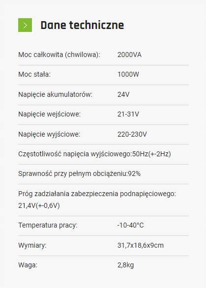Електронний перетворювач SINUS ECO 2000 24V використовується для живлення електричних пристроїв, які потребують змінної напруги 230V від акумуляторів і автомобільних установок з 24V постійна напруга. Ідеально підходить для транспортних засобів (наприклад, кемперів) і місць, де неможливе пряме підключення до електромережі.