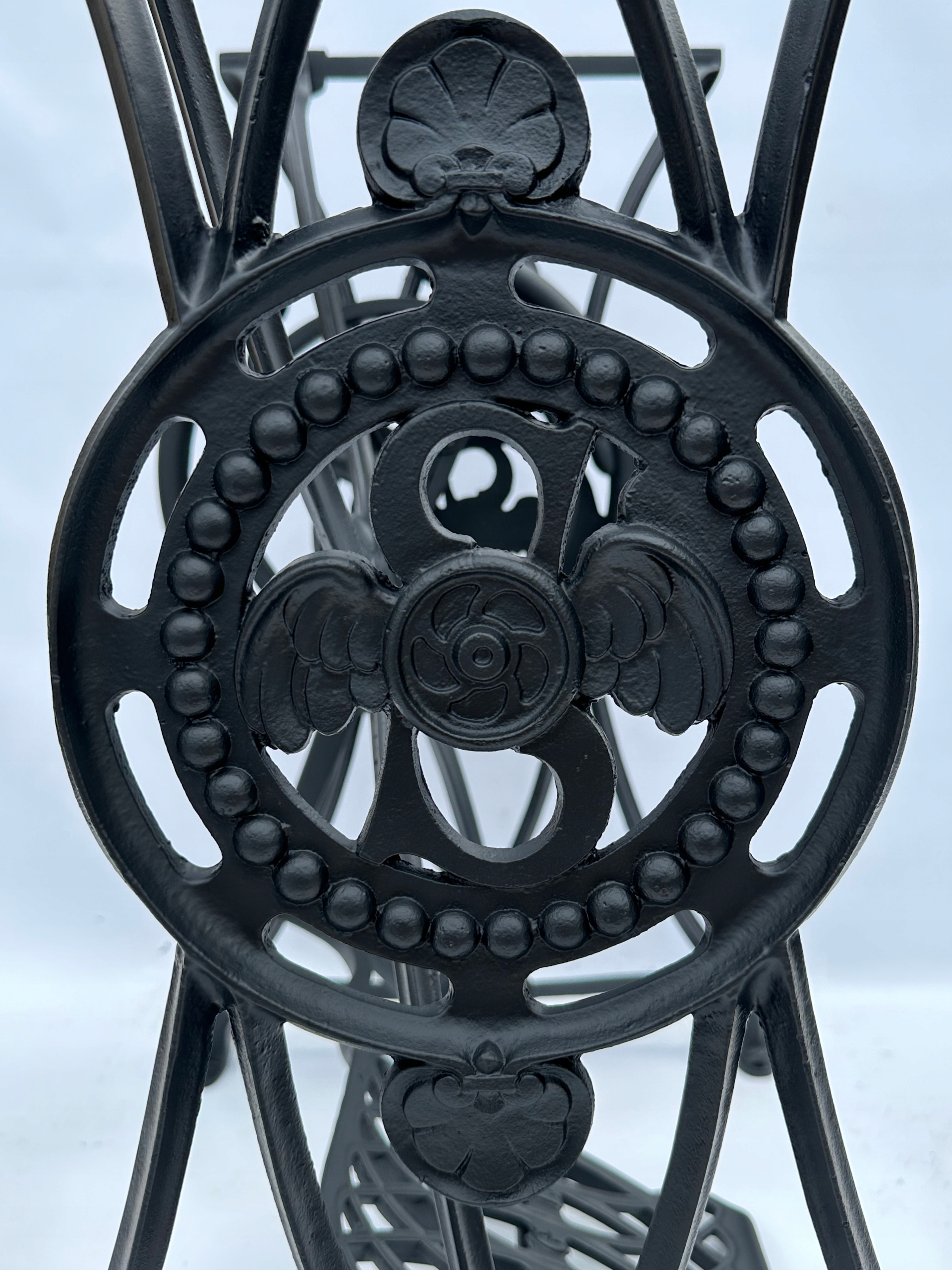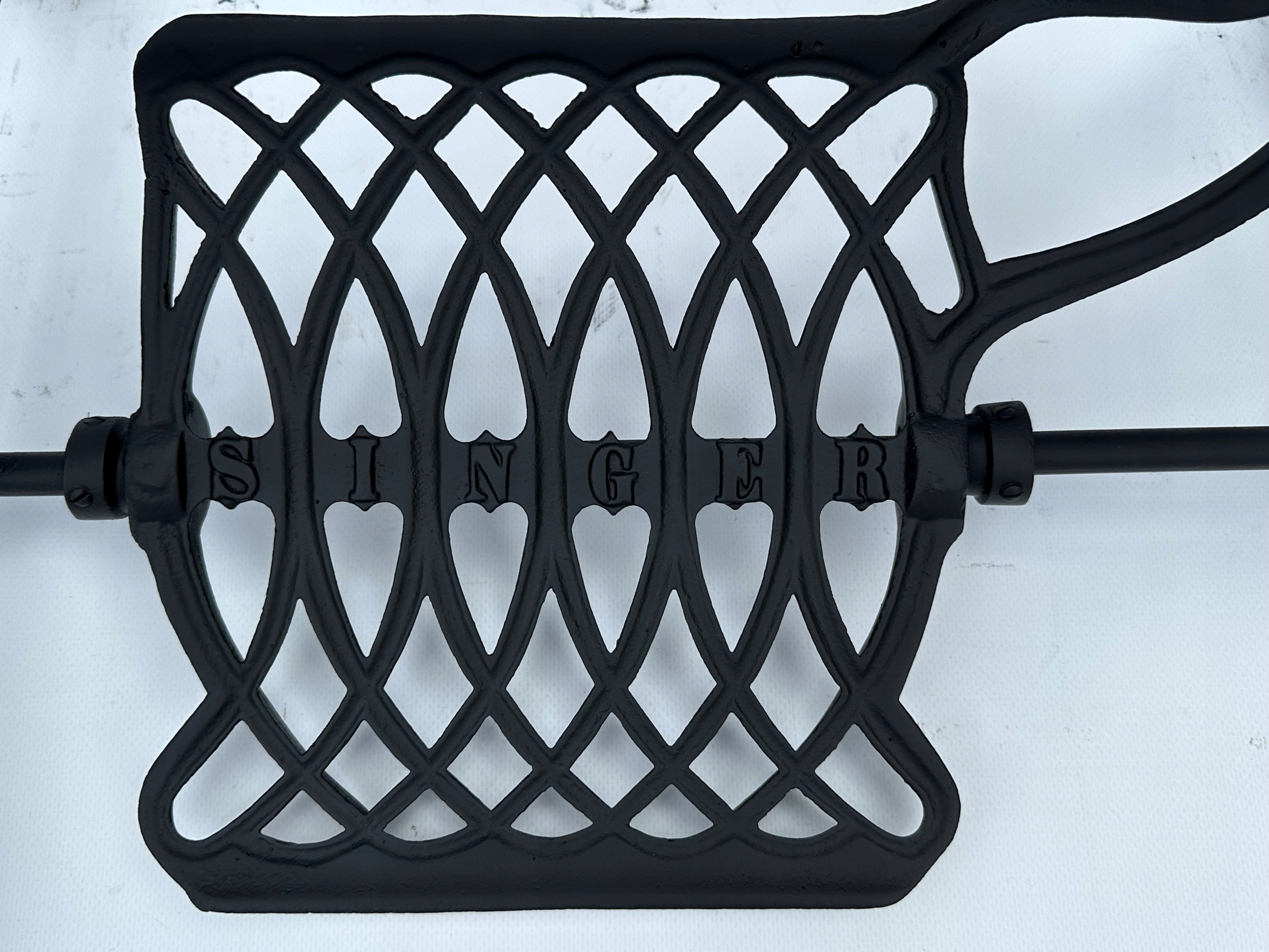 Предмет продажу стара чавунна основа від швейної машинки SINGER. Дуже гарний візерунок, менш поширений. На приводному елементі напис SINGER. Він має обидва колеса внизу.