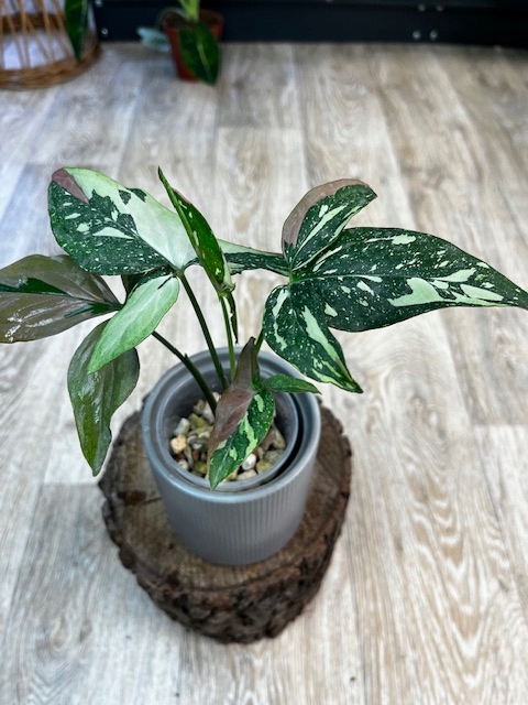 Сингоніум червоний плямистий — один із унікальних, гарячково затребуваних сортів із надзвичайно декоративним листям. Він радує своїм зелено-рожево-кремовим, строкатим забарвленням, з великим відсотком листової пластини, вкритої ефектним рожевим забарвленням, цятками і цятками.