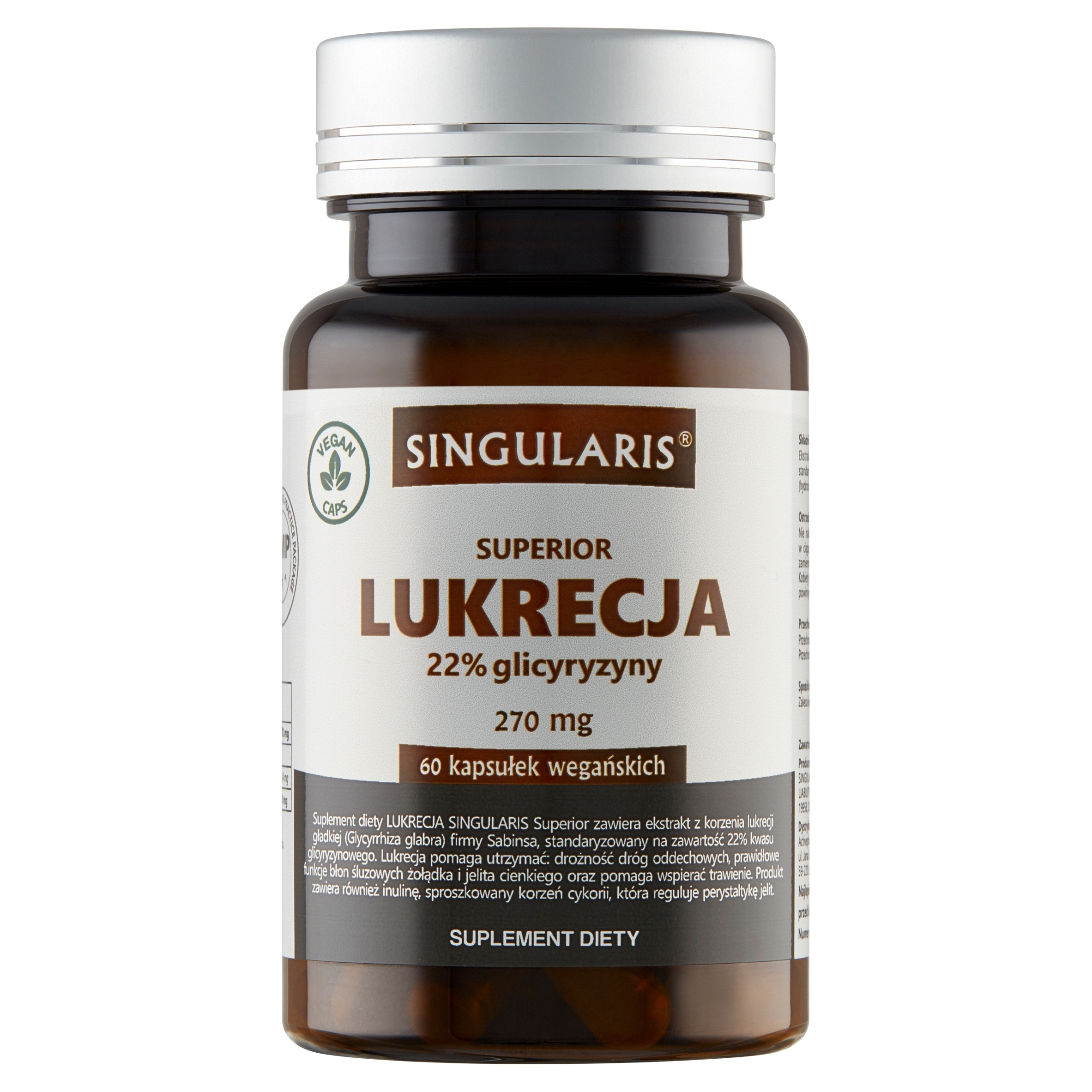 Singularis Superior Licorice 22% Glycyrrhizin 270 mg - це дієтична добавка, що містить екстракт гладкого кореня солодки (Glycyrrhiza glabra), стандартизований до 22% гліциризинової кислоти. Він також містить інулін (порошок кореня цикорію).