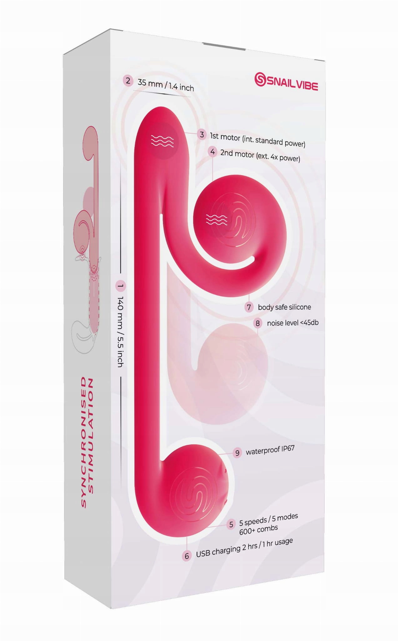 Snail Vibe поєднує в собі всі особливості найпопулярніших еротичних гаджетів: надзвичайну потужність вібратора, рух вперед-назад вібратора push-up, вагінальну стимуляцію та одночасну стимуляцію клітора. Це можливо завдяки унікальній запатентованій формі спіралі та індивідуальній роботі 2 двигунів.
