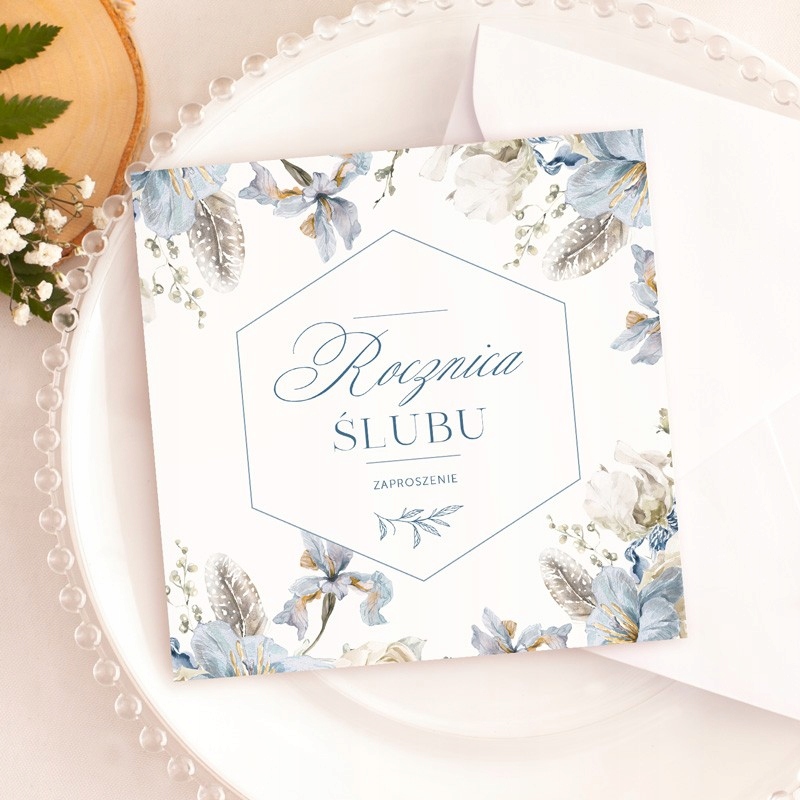 - Елегантні запрошення на річницю весілля виготовляються з високоякісного паперу. Вони мають красиву квіткову графіку з ніжним пір’ям у блакитних кольорах. Обкладинка ювілейних запрошень містить шестикутник з текстом всередині: Запрошення на річницю весілля. Всередині запрошень є графічний мотив, який ідеально збігається з мотивом на обкладинці. З правого боку є готовий текст, який потрібно самостійно доповнити найважливішою інформацією про ювіляра. Зліва на обкладинці розміщено текст: