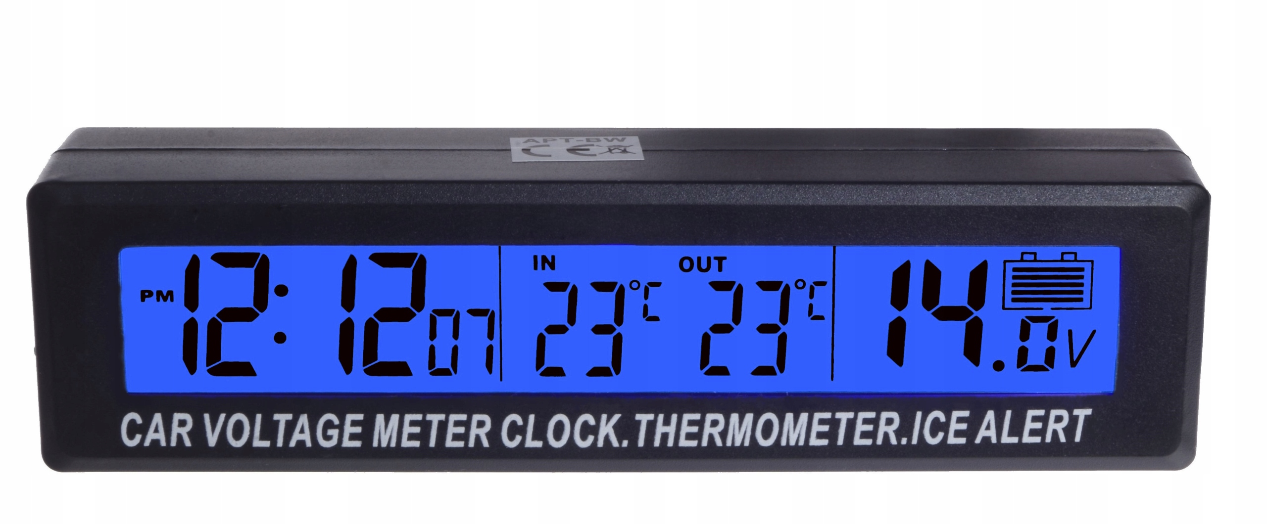 - Термометр має великий чіткий РК-дисплей із підсвічуванням (підсвічування живиться від гнізда автомобільного прикурювача), що одночасно відображає температуру від двох датчиків, часу та напруги акумулятора, а після запуску двигуна – напругу зарядки генератора.