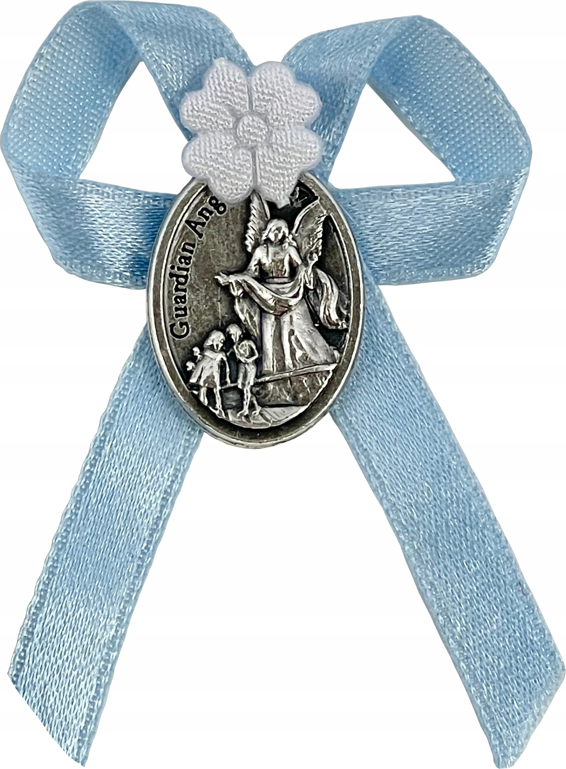 Атласний бантик синього кольоруна коляску, ліжечко, крісло і т.д. зі срібним медальйоном із зображеннямАнгела-Хранителя