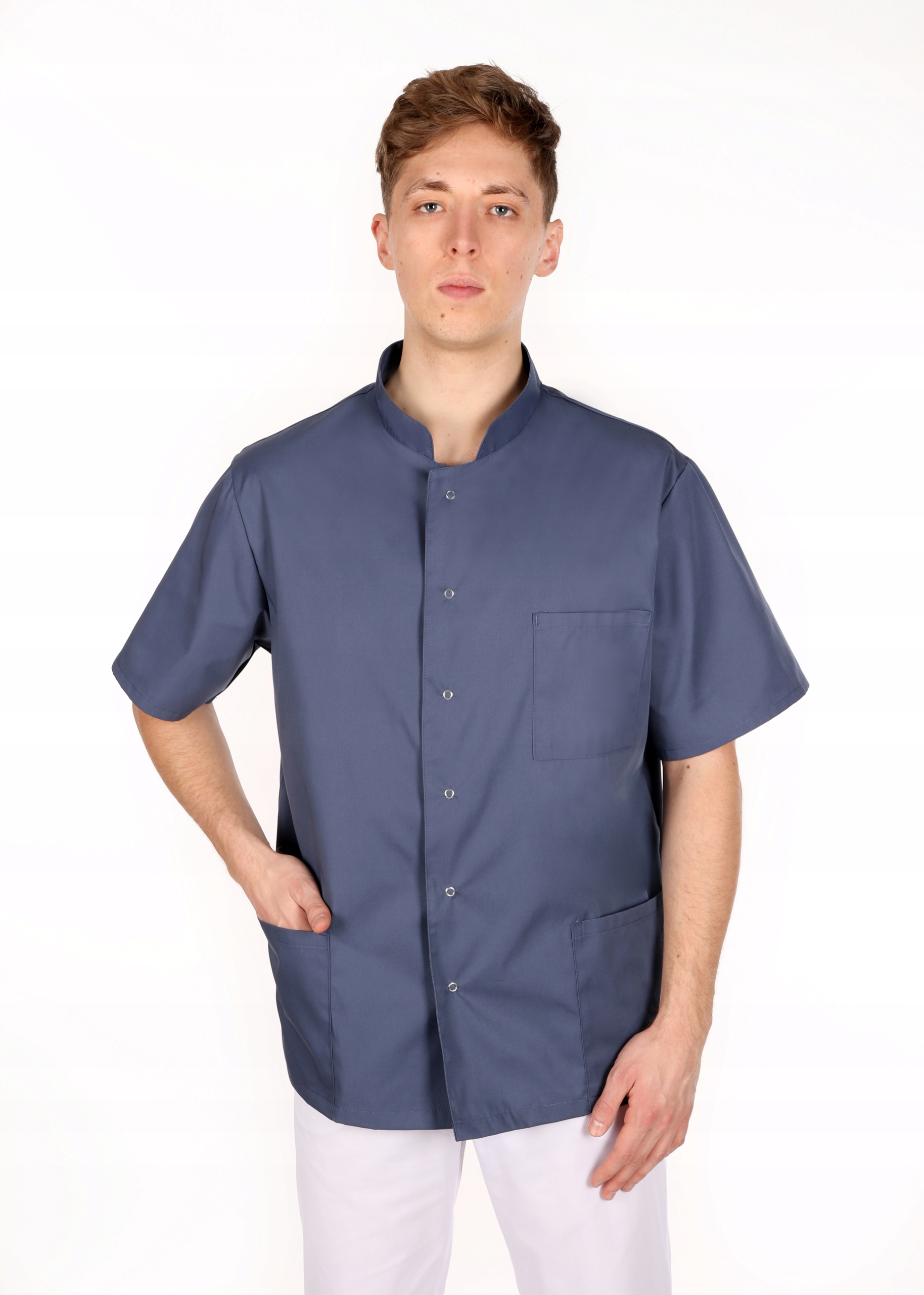 З низьким коміром-стійкою, короткими рукавами, двома кишенями на рівні стегон і кишенею зліва на грудях (тут рекомендуємо розмістити логотип компанії або персоніфікацію флока - для цього звертайтеся до виробника). p>