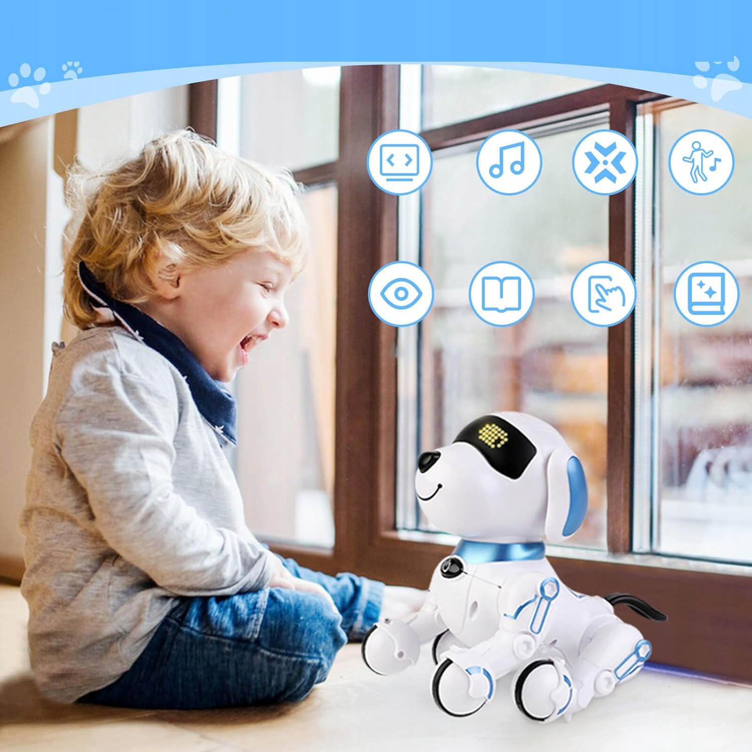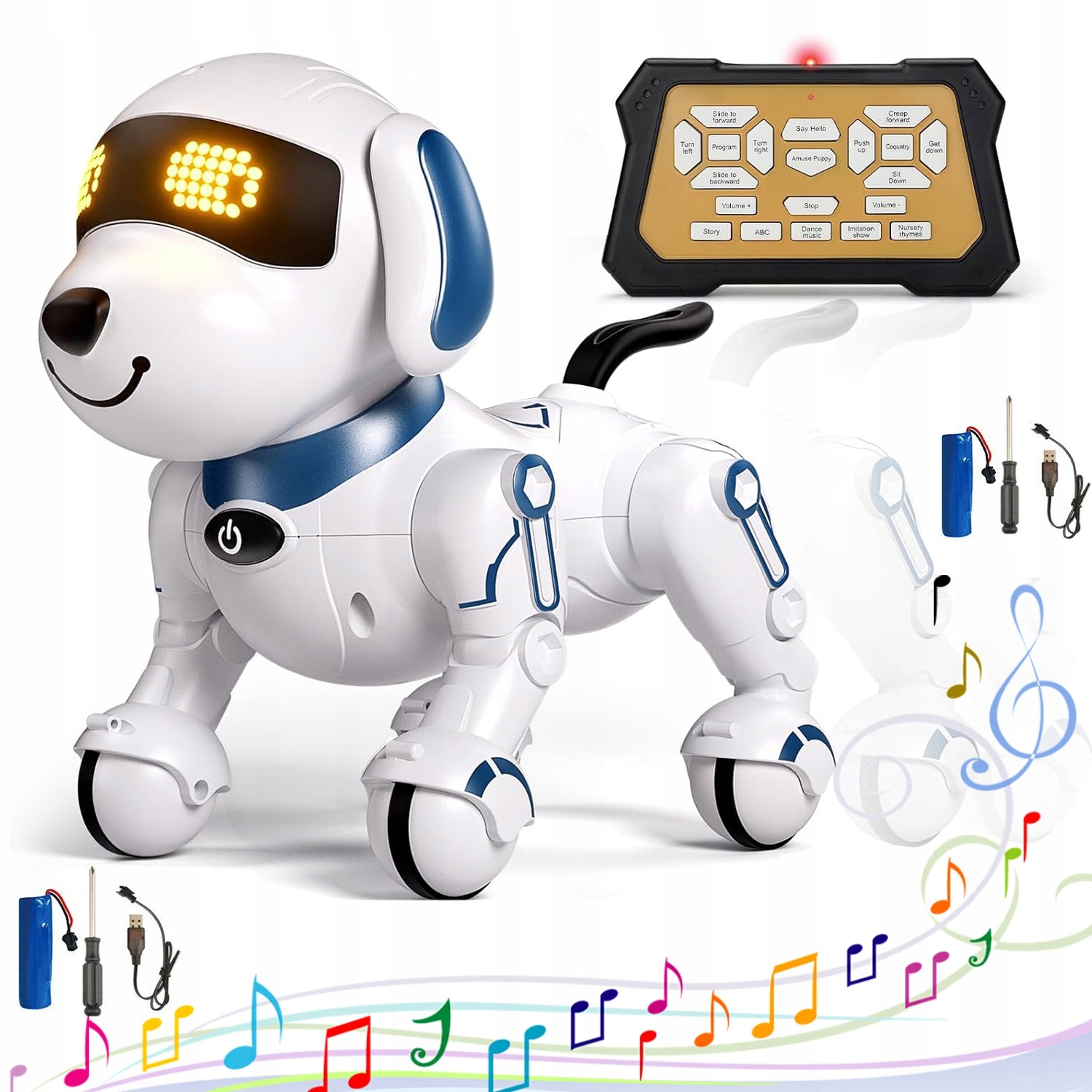-ун інтелектуальний собака-робот-це багатофункціональний супутник науки, , який може розповідати історії, співати дитячі рими, танцювати, викладати англійську мову та наслідувати 6 різних звуків тварин, надаючи дітям різні освітні та розважальні враження. Використовуючи кнопку програмування на пульті дистанційного керування, ваша дитина може вільно програмувати Dobot для виконання низки заходів.