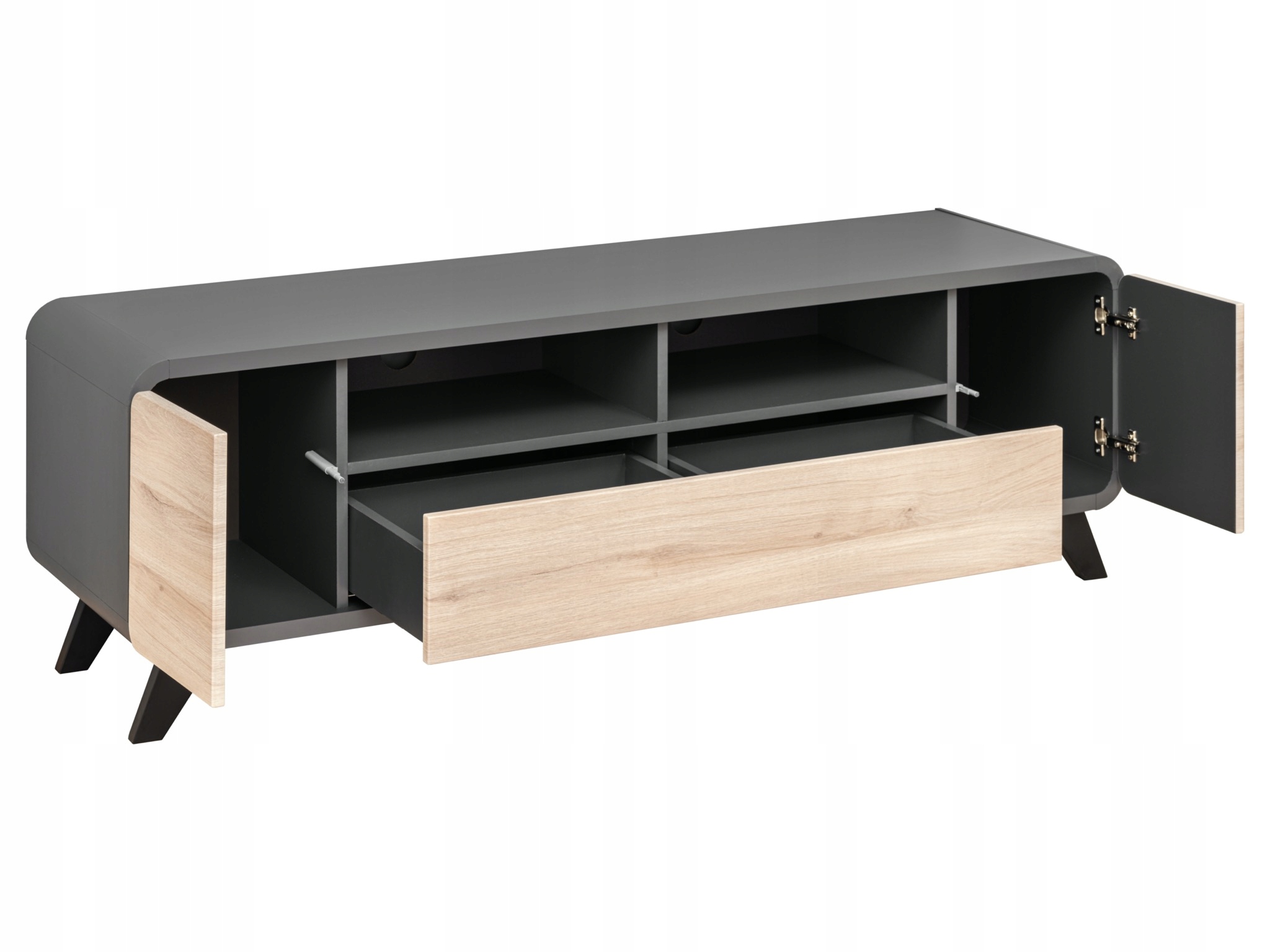 Дверцята, що відкриваються праворуч і ліворуч, з одним відділенням за ними. Посередині вгорі два відкритих відділення, внизу двоярусна шухляда на загальній передній частині. Корпус із загнутими краями.