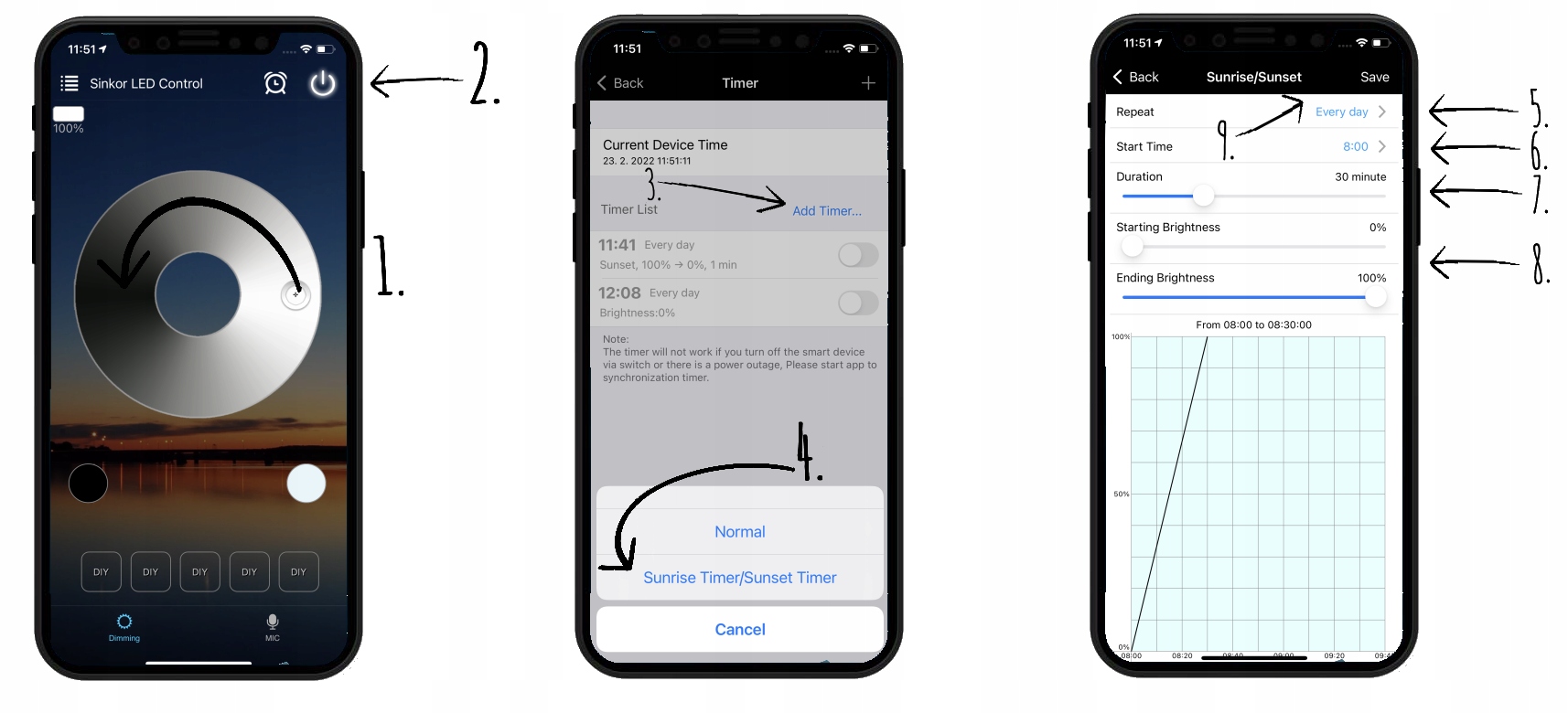 Sinkor LED Wifi Control дозволяє дуже легко налаштувати світло за допомогою мобільного телефону. У інтуїтивно зрозумілій програмі ви можете легко запрограмувати освітлення на цілий день, щоб затемнення та інтенсивність світла повторювалися щодня в певний час.