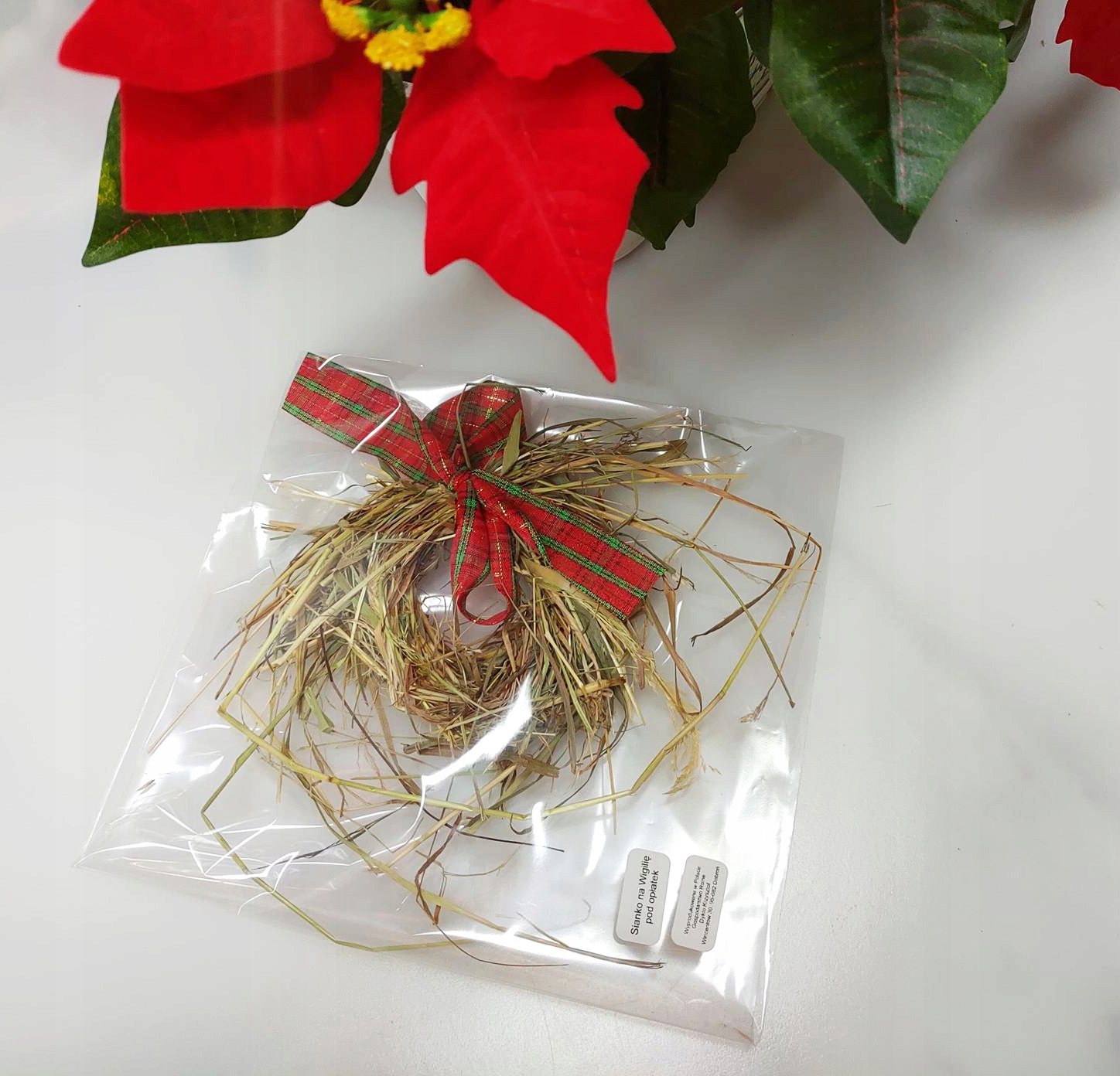 Сіно під облаткою до святвечірнього столу, пучок перев'язаний червоно-зеленою стрічкою в поліетиленовому пакеті