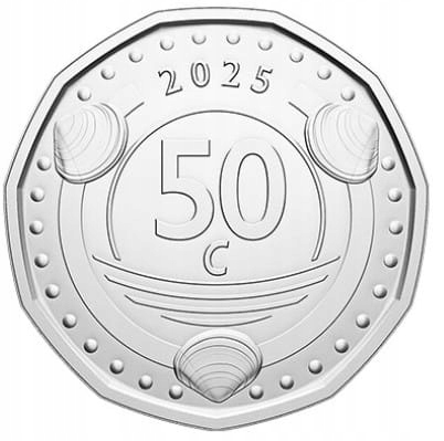 Реверс: уздовж краю три групи по десять перлин у кожній – посилання на дату 10 жовтня 2010 року, коли Кюрасао та Сінт-Мартен стали автономними державами в складі Королівства Нідерландів. Між групами перлин угорі та внизу зображення раковини морського молюска виду Tellina. У центрі стилізоване небо та океанські хвилі. Між ними номінал і абревіатура субодиниці: 50 / c. Над номіналом, рік випуску: 2025
