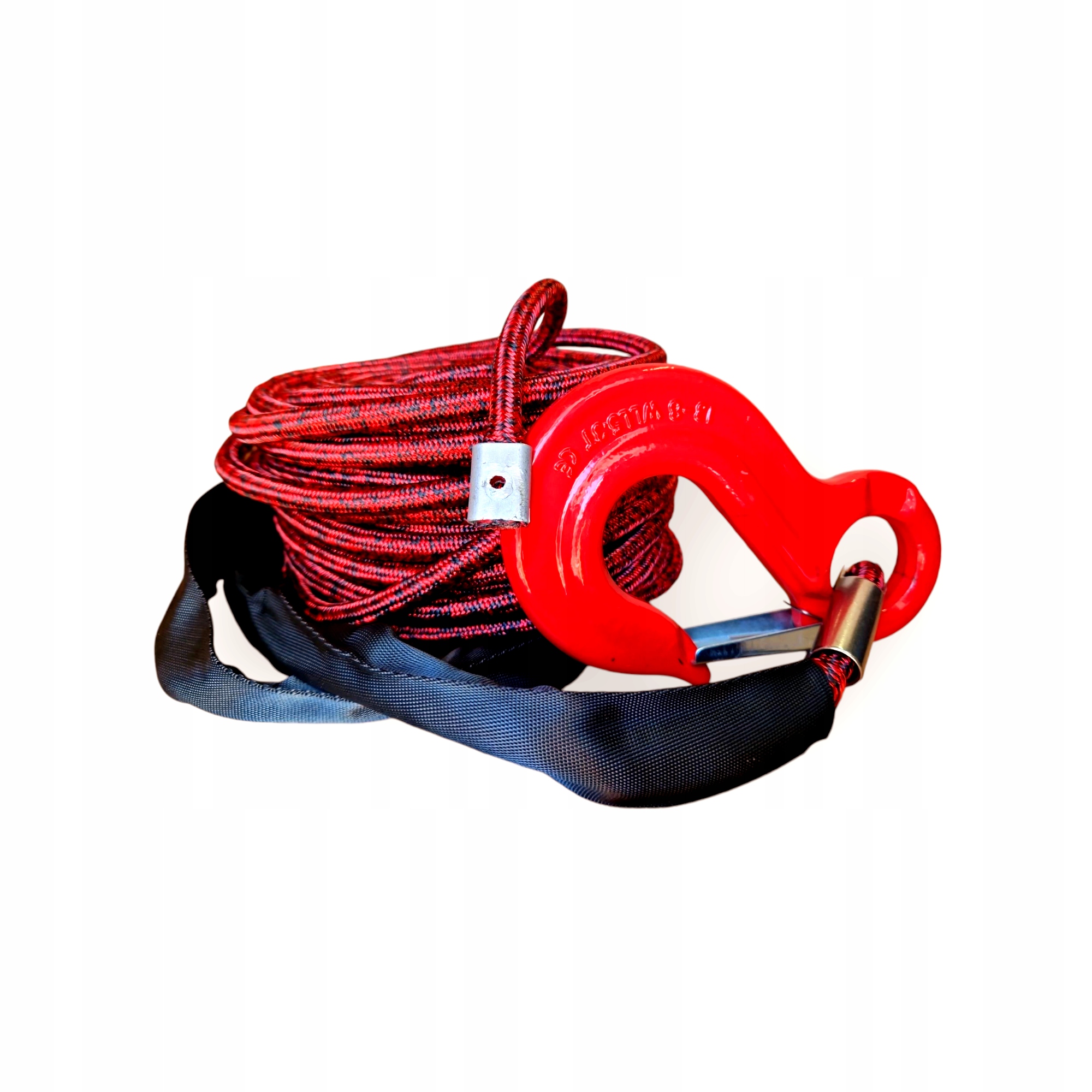 Універсальний синтетичний трос довжиною 28 метрів і діаметром 12 мм підходить для будь-якої лебідки. Протягом багатьох років в електричних лебідках замість сталевого канату використовується синтетичний трос. На кінці каната є кожух і гак, а з іншого боку є вушко для кріплення до барабана лебідки. Синтетична мотузка характеризується надзвичайно високим співвідношенням міцності волокна до ваги, високою стійкістю до стирання та низьким вологопоглинанням. Мотузка м'яка, що полегшує змотування.