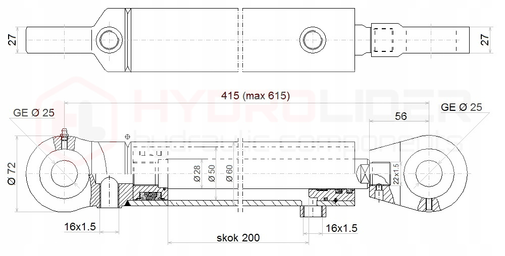 - Поршневий шток (стрижень) діаметр: 28 мм