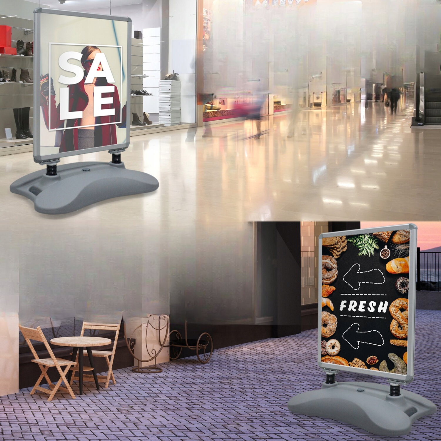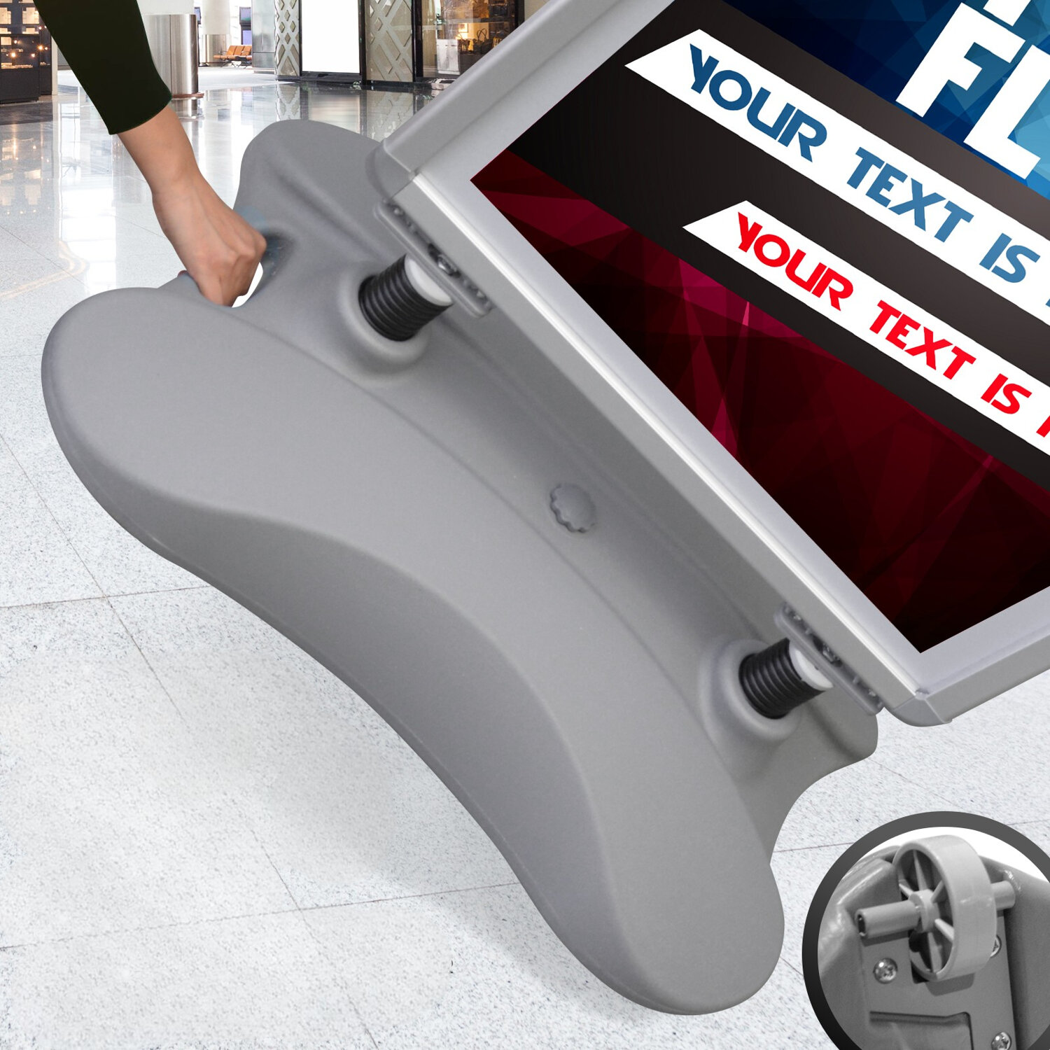 Ця двостороння підставка, безсумнівно, успішно донесе чітке рекламне повідомлення. Його основу можна наповнити водою або піском, а завдяки бічним коліщаткам і ергономічній ручці його легко переміщати. Завдяки захисній плівкі, алюмінієвій рамі та пластиковій основі він підходить як для внутрішнього, так і для зовнішнього використання.