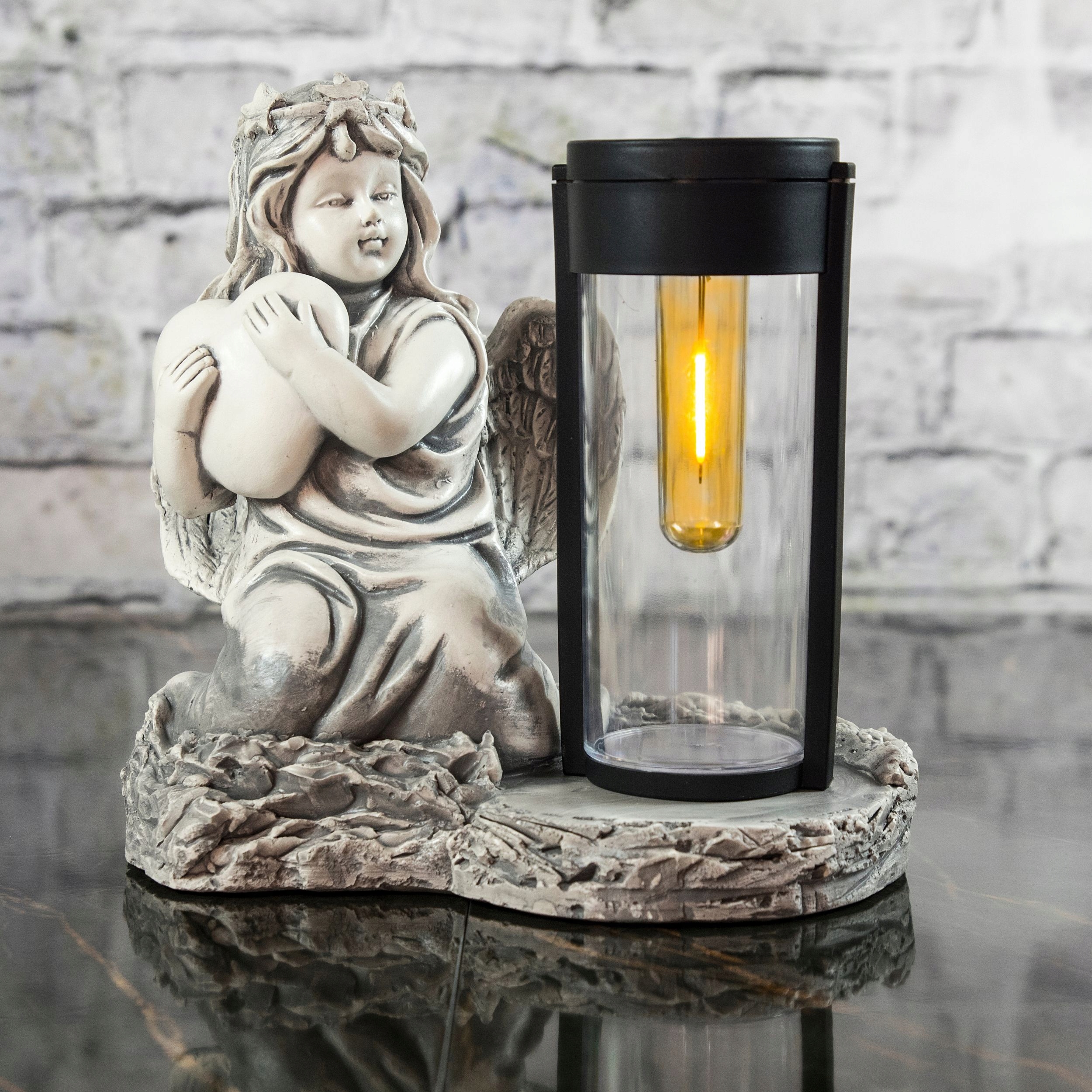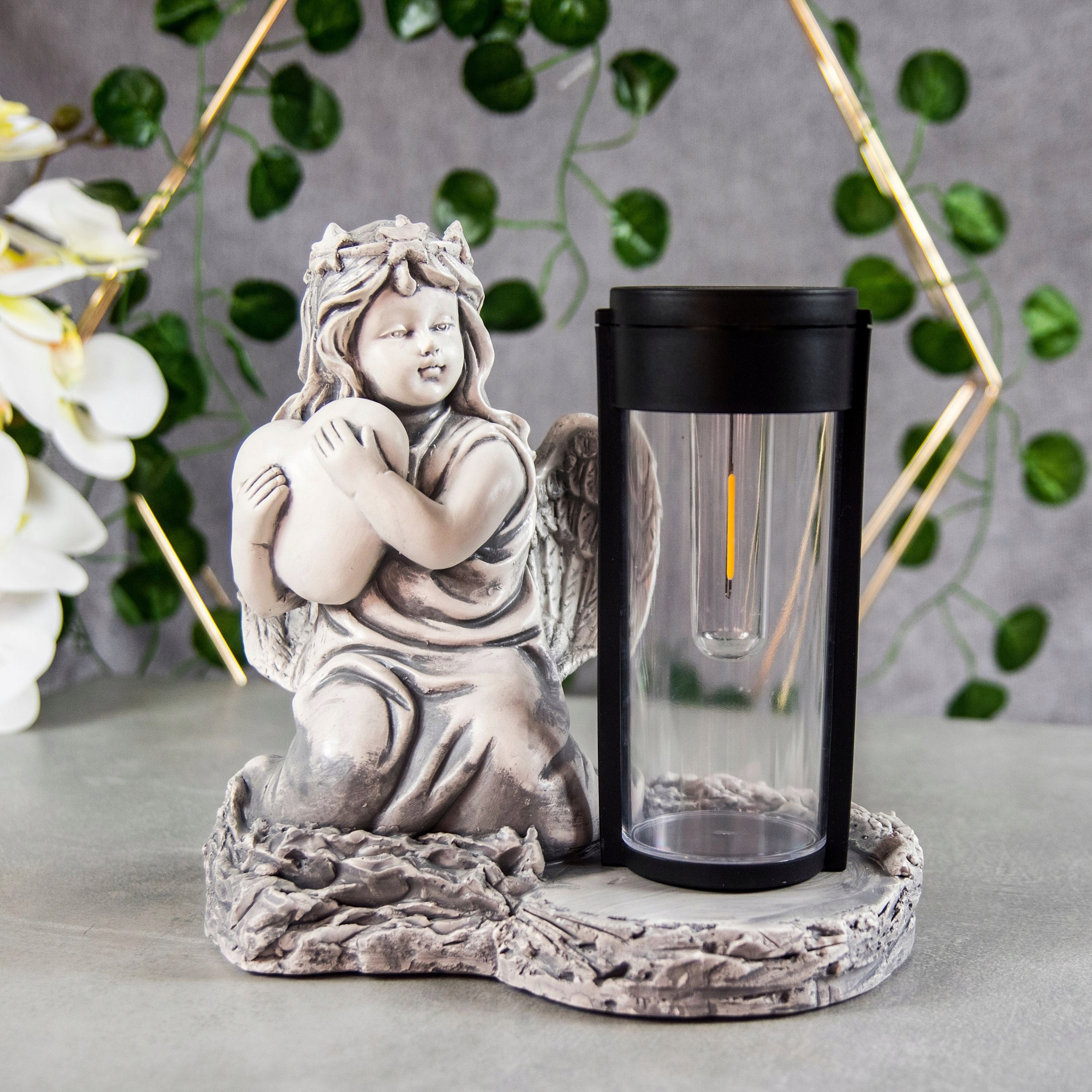 ➡️ Елегантна гіпсова фігурка ангела в сірих відтінках із серцем у поєднанні з сучасною великою світлодіодною сонячною лампою.