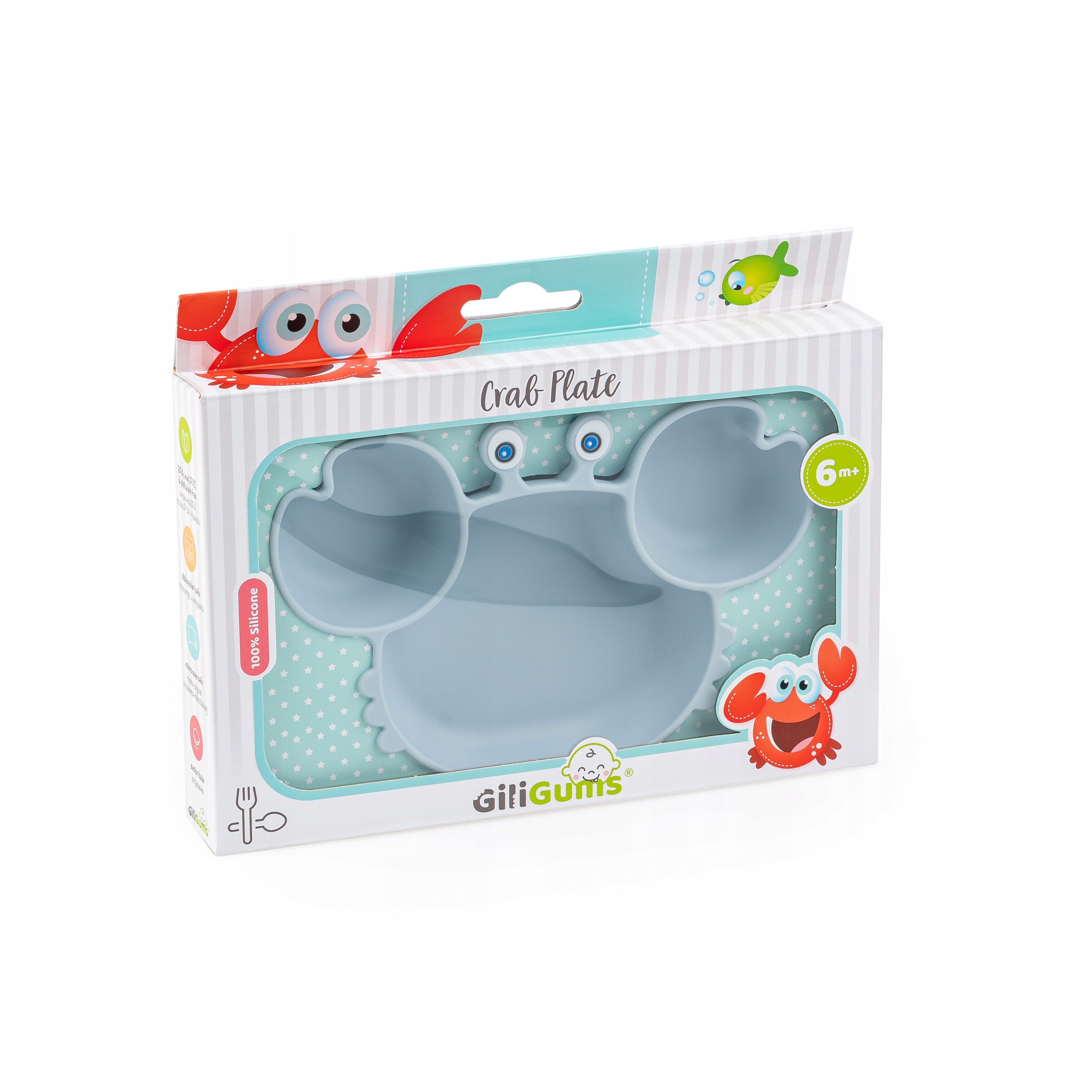 СІРА КРАБОВА ТАРІЛКА Відкрийте для себе радість їсти самостійно з крабом! Чарівна тарілка оснащена практичною присоскою, щоб тарілка не рухалася. Зручні відділення полегшують розділення страви на окремі інгредієнти, щоб малюк міг відкривати смаки та текстури, навчаючись їсти всіма почуттями. Пластина виготовлена з силікону, що полегшує її очищення. Продукт призначений для дітей віком від 6 місяців.