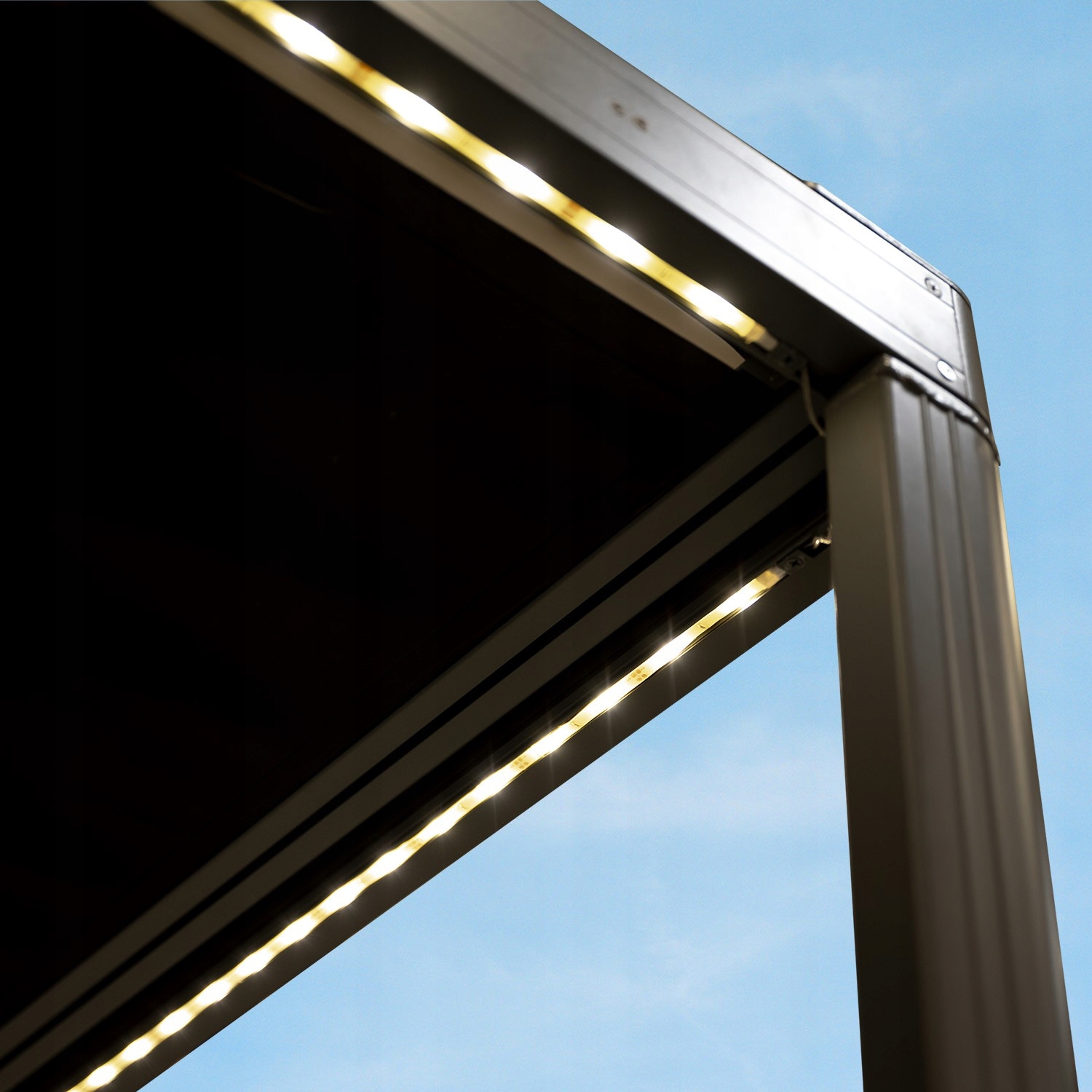 Пергола тераси оснащена світлодіодним освітленням, яке забезпечує ідеальну атмосферу на терасі. темними вечорами. Таке рішення не тільки практичне, але й дуже естетичне, що дозволяє створити затишний та елегантний простір на терасі.