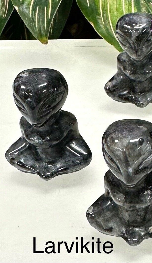 Фігурка прибульця, виготовлена з ларвікіту, також відомого як норвезький лабрадорит. Він буває різних відтінків сірого; він також може мати суміш темно-синіх, зелених і чорних відтінків.