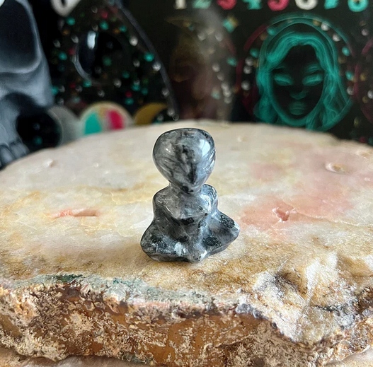 Фігурка інопланетянина, що медитує, виготовлена з природного каменю - ларвікіту (норвезького лабрадориту)