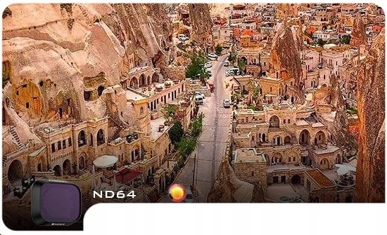 Фільтр ND64 зменшує кількість світла, що потрапляє в об’єктив, на шість діафрагм. Окрім подовження часу експозиції, ND-фільтри також допомагають уникнути ефекту «желе».