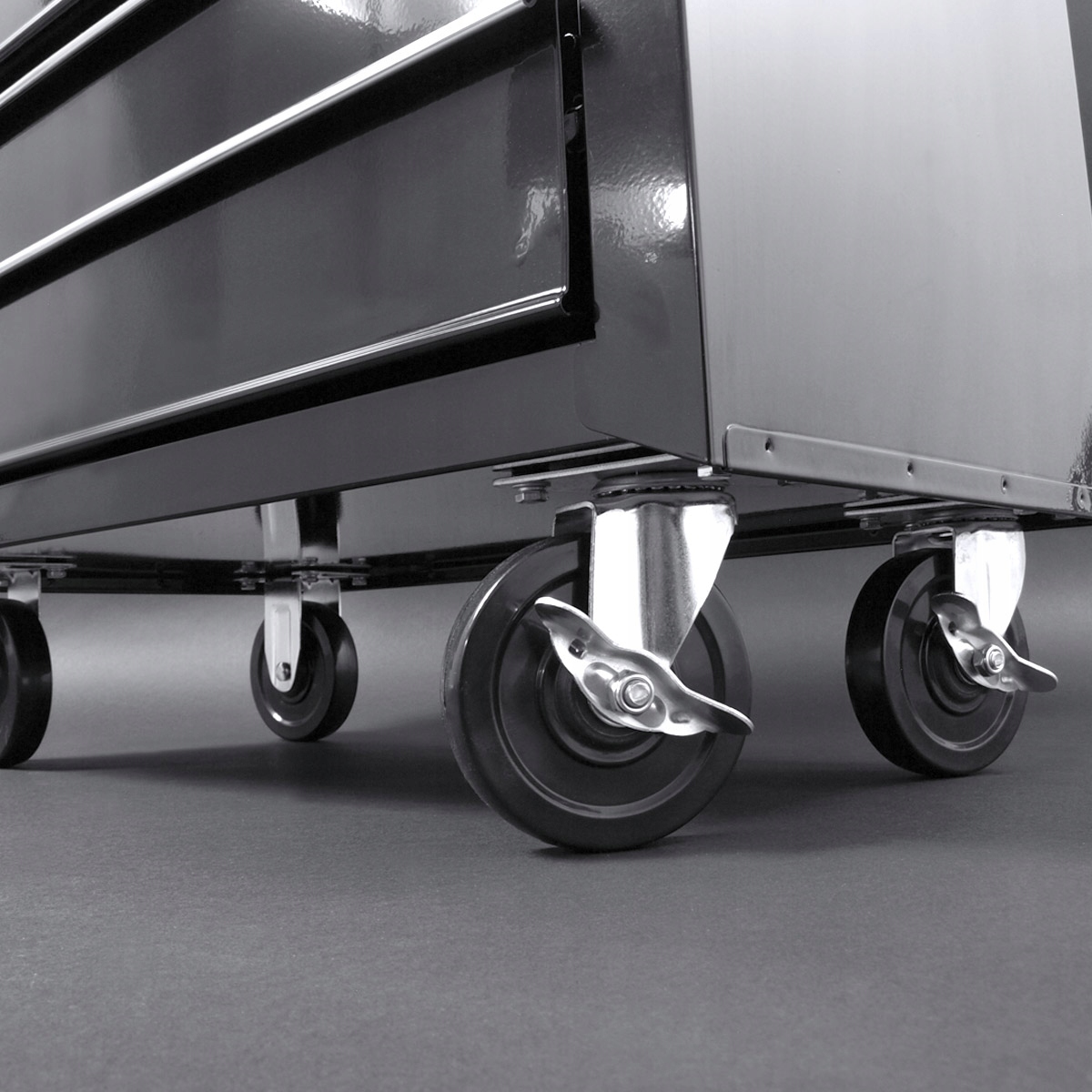 - 7 містких ящиків, 5 - 510x280x90 мм, 2 - верхні 510x280x44 мм - стільниця з антиковзаючим килимком, який при необхідності знімається - 4 стабільних великих 10см. колеса, в тому числі два поворотних колеса з ножним гальмом - ручка для допомоги при переміщенні - розміри 615х330х750 мм - розміри 615x330x860 мм з колесами - вага приблизно 28 кг - всі ящики закриваються на один замок (2 ключа в комплекті) - чорний колір