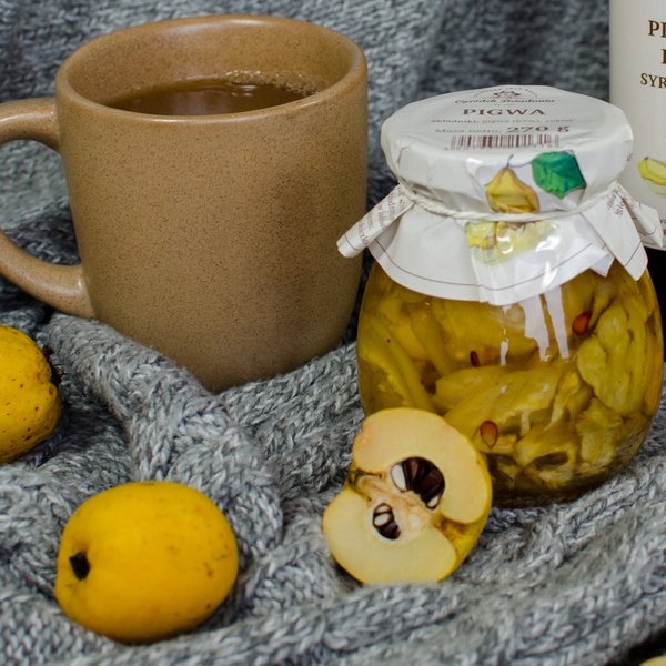 Скибочки айви, занурені в солодкий сироп. Характерний аромат і терпкий смак айви додасть характеру гарячим напоям, особливо до чаю та пива.