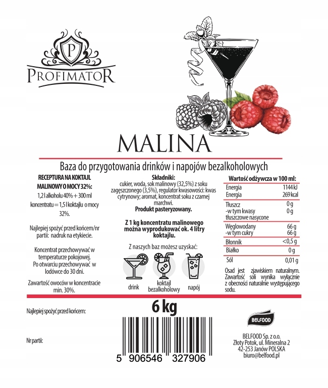 На основі Profimator можна готувати напої та коктейлі з натуральним глибоким ароматом малини. Ідеально підходить для приготування домашніх коктейлів та інших алкогольних напоїв, а також для десертів і безалкогольних напоїв.