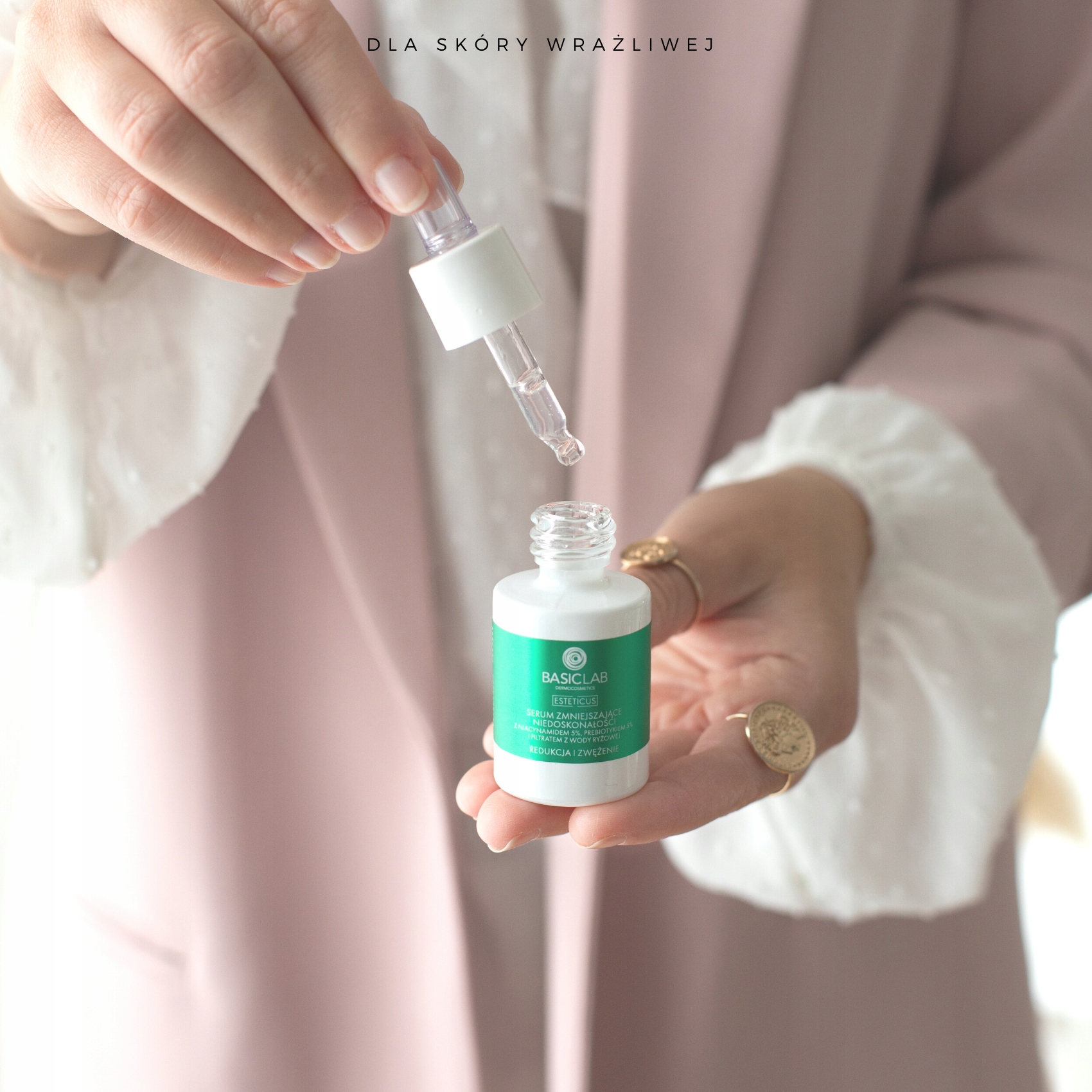 - 5% концентрація ніацинаміду (вітамін В3) ефективно регулює роботу сальних залоз, сприяючи правильна секреція шкірного сала і зменшення видимості пор. Ніацинамід рекомендований для сухої, гіперчутливої, схильної до зміни кольору, зрілої та схильної до акне шкіри. Відомий своїми властивостями проти зморшок, він зменшує тонкі зморшки, розгладжує та помітно покращує структуру та тонус шкіри. Найкращий ефект помітний через 12 тижнів систематичного застосування. Крім того, це інгредієнт, який стимулює вироблення церамідів, а отже, ліпідів, тому він безпосередньо покращує ліпідний бар’єр епідермісу.