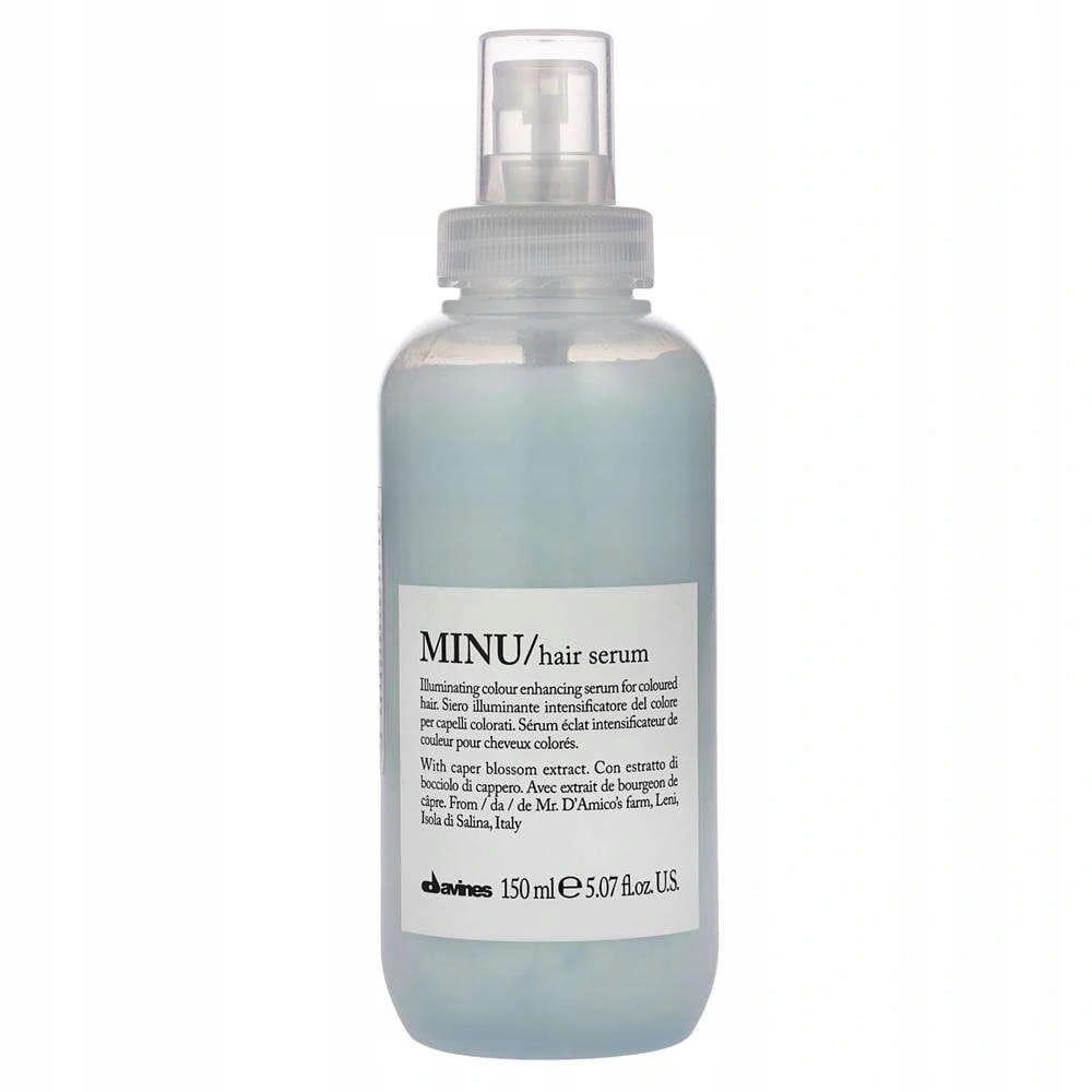 Davines Minu Hair Serum – незмивна освітлююча сироватка для фарбованого волосся. Формула, багата кверцетином, сильною амінокислотою, яка зміцнює структуру волосся, а також поліфенолами, які захищають колір. Містить екстракт квітки каперсу з Salina - Slow Food Presidium, ферми пана Salvatore D'Amico з Лені, острів Саліна, Мессіна. Ідеально підходить для надання виняткового блиску та продовження стійкості косметичного кольору. Для всіх типів волосся.