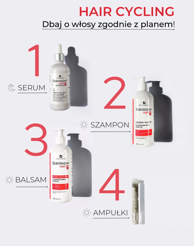 Продукт є частиною процедури проти випадіння волосся Seboradin FORTE. Його поетапне застосування, згідно з методом HAIR CYCLING, дозволяє досягти найбільш задовільних результатів. Серія особливо рекомендована при: