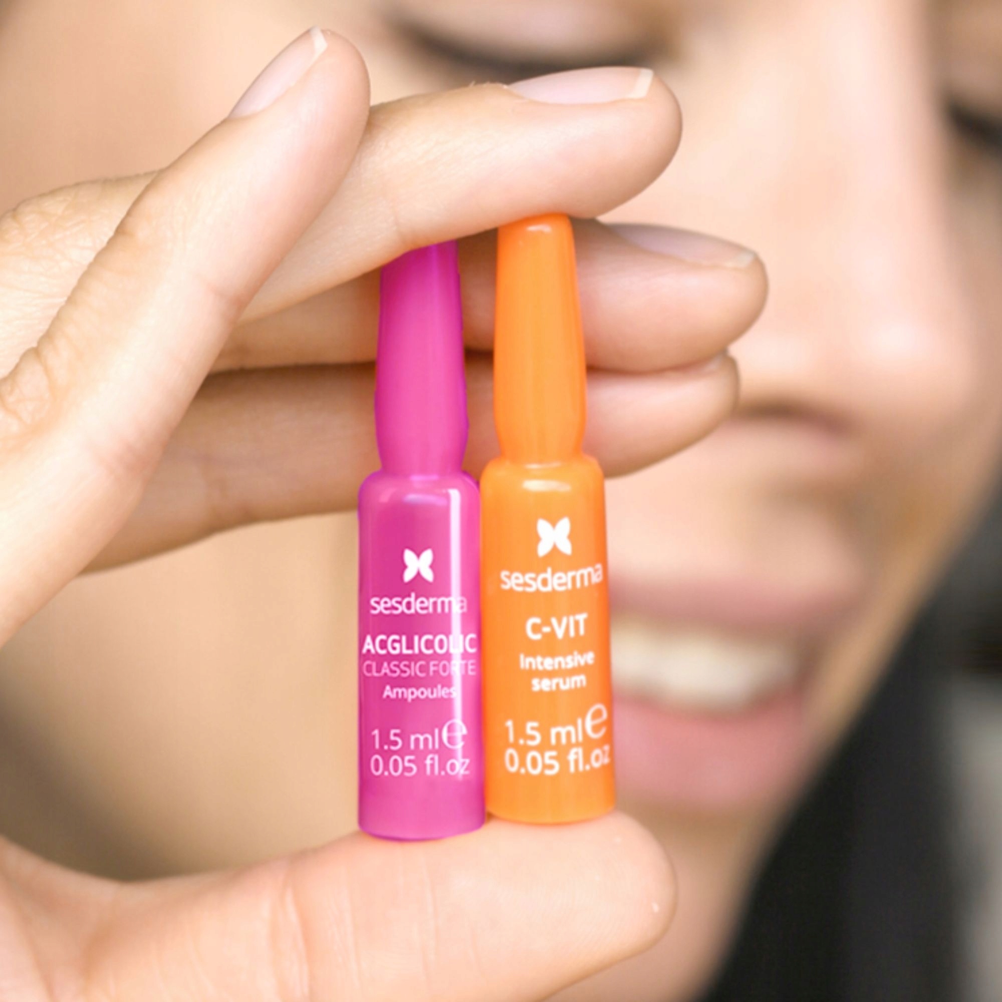 Отримайте миттєвий освіжаючий і освітлюючий ефект завдяки ампулам Sesderma FLASH EFFECT 1xACGL 1,5 мл + 1x C-VIT 1,5 мл 12%. Поєднання ампул Acglicolic, багатих гліколевою кислотою (10%), із сироваткою C-VIT, що містить високу концентрацію чистого вітаміну С (12%), забезпечує миттєвий ефект освітлення шкіри.
