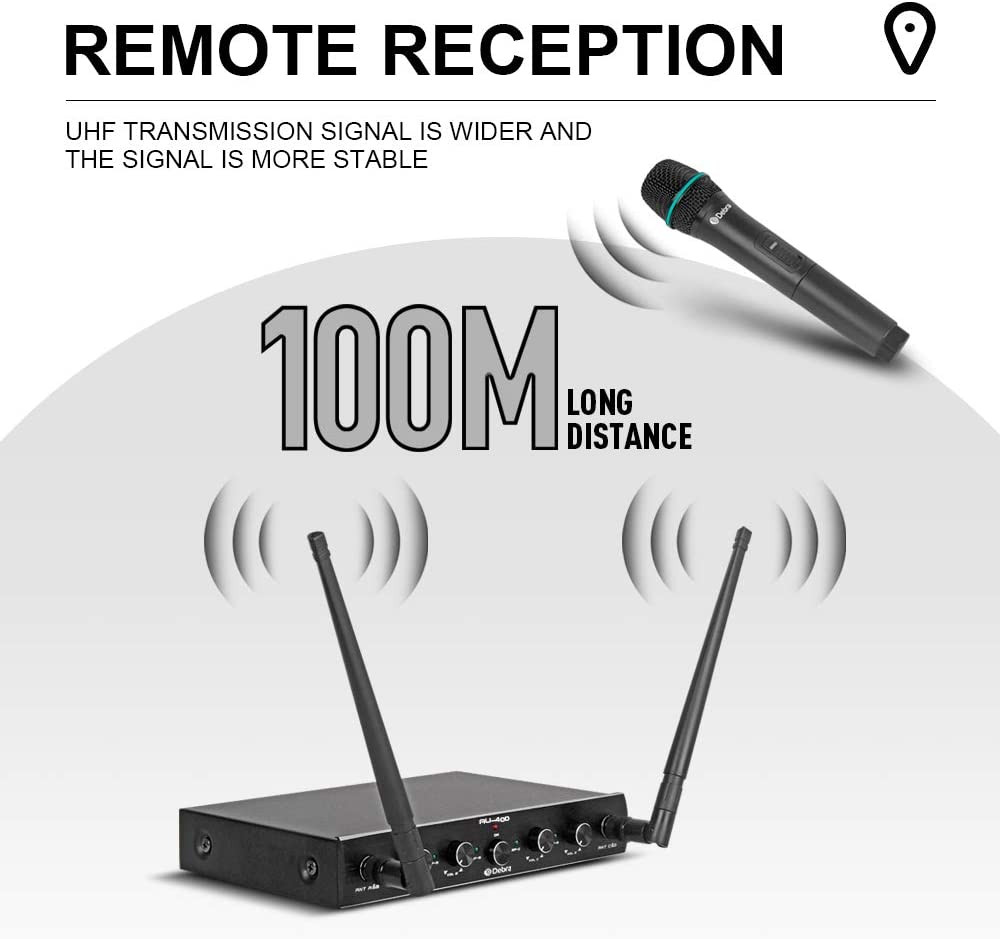 Стабільний постійний сигнал UHF забезпечує безпрецедентну роботу без перешкод і спотворень, діапазон роботи становить до 300 футів у лінії зору на відкритому місці. Краще, ніж будь -яка бездротова система мікрофонів VHF