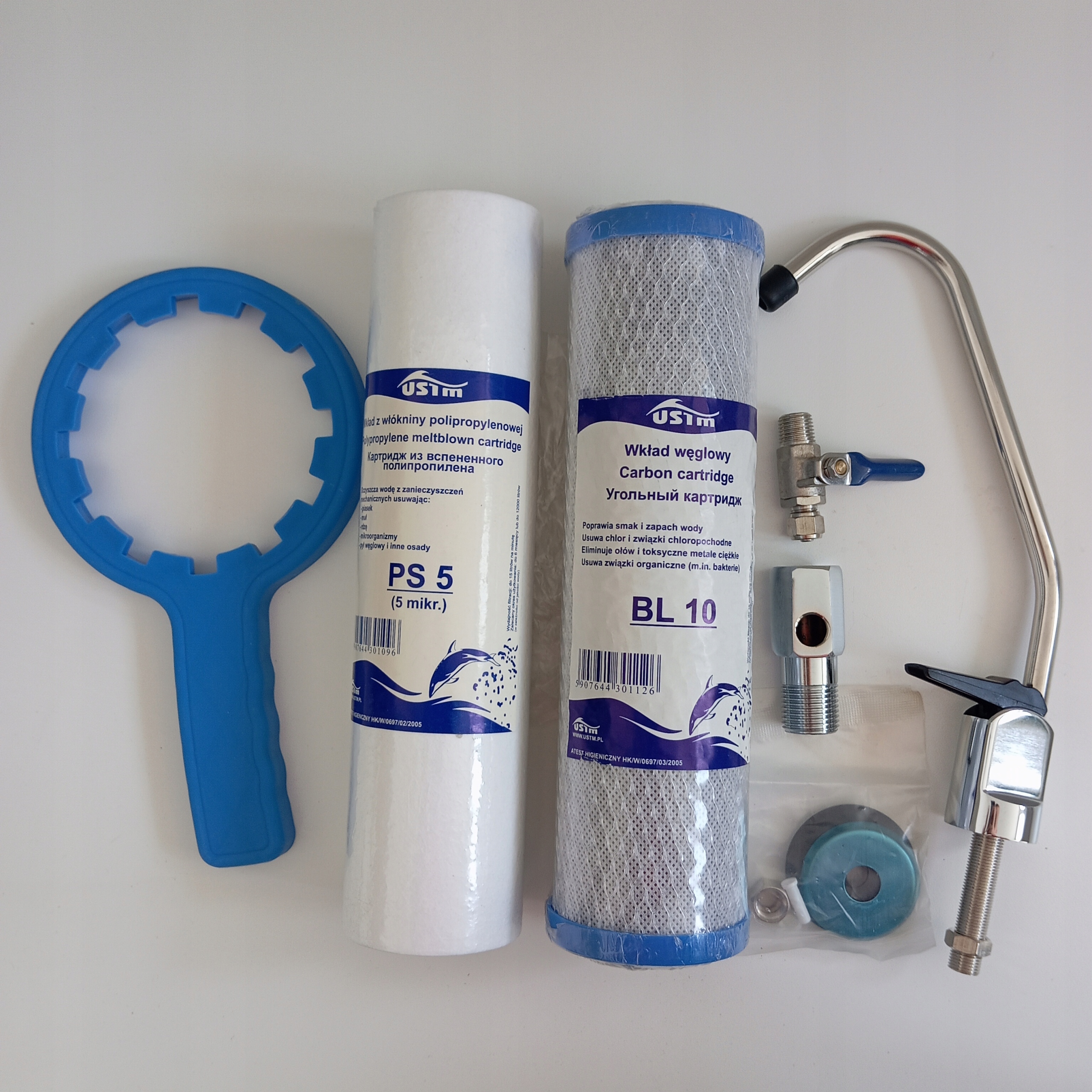 Призначення: фільтри USTM з двома етапами системи фільтрації води, що встановлюється під кухонною раковиною. Економічна система та проста у встановленні забезпечують кришталево чисту воду, смак та аромат. У наборі носик, набір з'єднань, два картриджі: піна PS5 та вуглець BL.