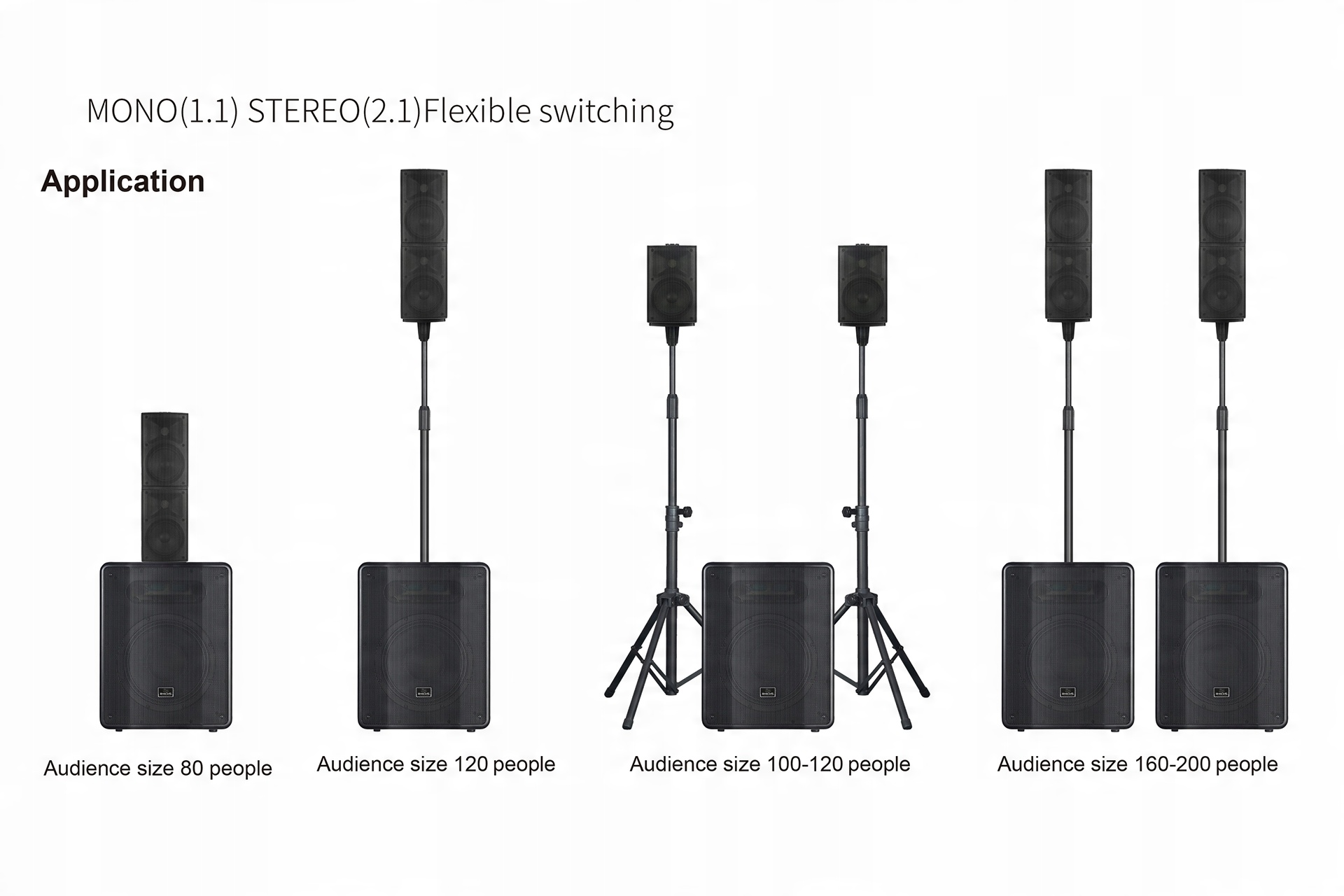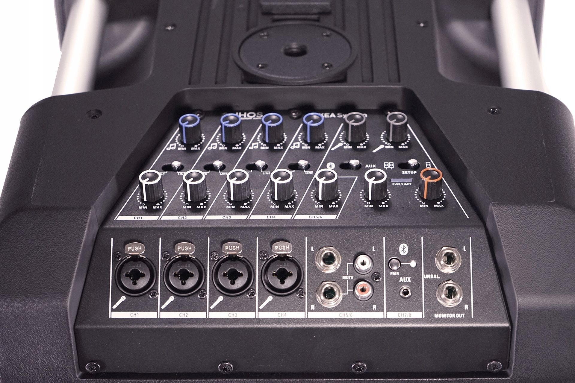 портативна система стовпців PA, світло і функціональна. 2 х 4? HF, 1x 10? Sub, 123 DB SPL, 255 Вт (Sub)+60 Вт (сб), німецький підсилювач класу D, смуга передачі 50-20 кГц, внутрішній 6-канальний міксер з ехо та ефектами затримки та Bluetooth.
