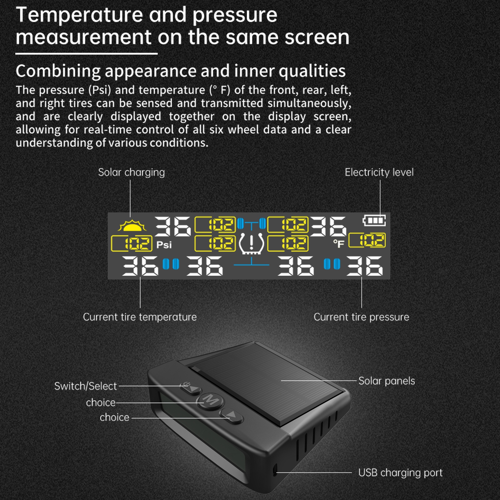 1. Дані даних у реальному часі: Система моніторингу шин одночасно вимірює та відображає тиск і температуру для всіх шести шин, надаючи драйверам критичну інформацію на перший погляд на оптимальну безпеку та обслуговування.