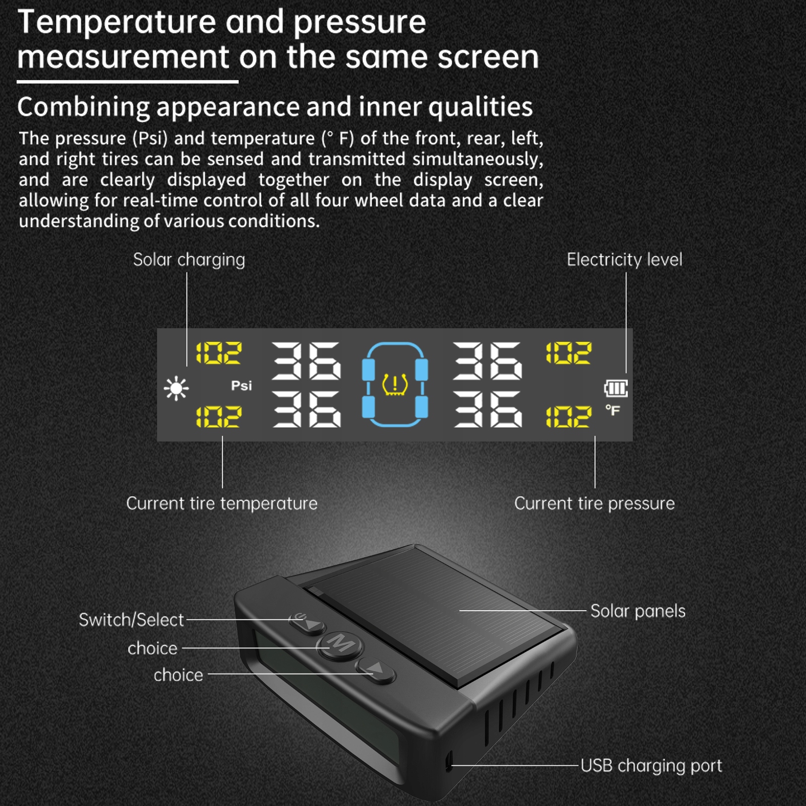 1. Система моніторингу вдосконаленої шини: Наша система моніторингу тиску сонячної шин пропонує реальний тиск та моніторинг температури шин, забезпечуючи безпеку дорожнього руху з негайними попередженнями щодо низького тиску або високої температури.
