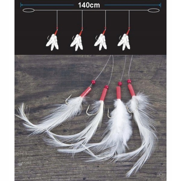 Система лову скумбрії з чотирма гачками. Червоно-білий колір спокусливий. Над гачком червоний бісер, а на гачку біла пір'їнка. У набір входить EVA Board - пінопластова тарілка для лідерів.
