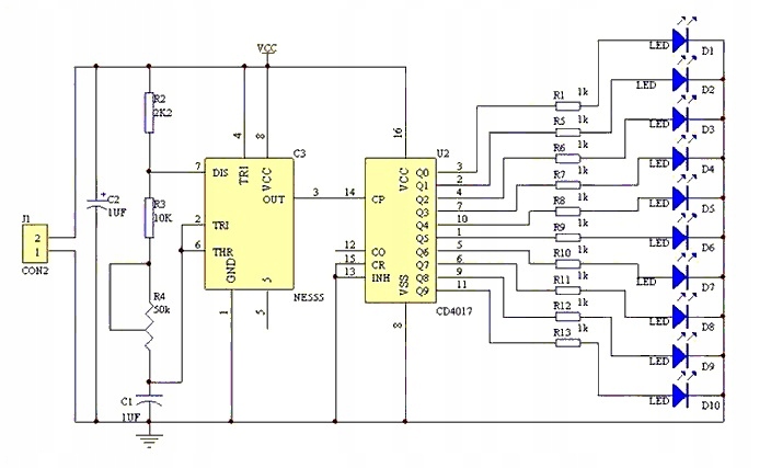 Цей комплект в основному складається зі схеми генерації тактового сигналу та схеми десяткового лічильника. Для зарядки конденсатора C1 через R2, R3 і R4 використовується мультивібратор із сердечником NE555. Коли C1 починає заряджатися, на контакті 2 NE555 все ще низький рівень, тому на контакті 3 вихідної клеми високий рівень. Коли джерело живлення заряджається на C1 через R2, R3 і R4 до 2/3 напруги джерела живлення, рівень контакту 3 вихідного терміналу змінюється з високого на низький, внутрішня зливна труба NE555 підключається, і конденсатор C1 розряджається через висновок 7 R4, R3 і NE555, коли напруга на обох кінцях C1 стає нижчою за 1/3 напруги живлення, рівень на виводі 3 NE555 знову змінюється з низького рівня на високий. C1 перезаряджається так, що цикл створює коливання. Час заряджання становить 0,695 (R2 + R3 + R4) C1, а час розряду становить 0,695 (R4 + R3) C1. Вихідну частоту генератора можна контролювати, регулюючи R4. Сигнал тактових коливань NE555 постійно додається до контакту 14 CD4017, а 10 світлодіодів підключаються до 10 вихідних клем CD4017. Коли 10 вихідних клем CD4017 по черзі генерують високі рівні під дією тактового сигналу, D1-D10 загоряються по черзі, таким чином створюючи ефект текучої водяної лампи.