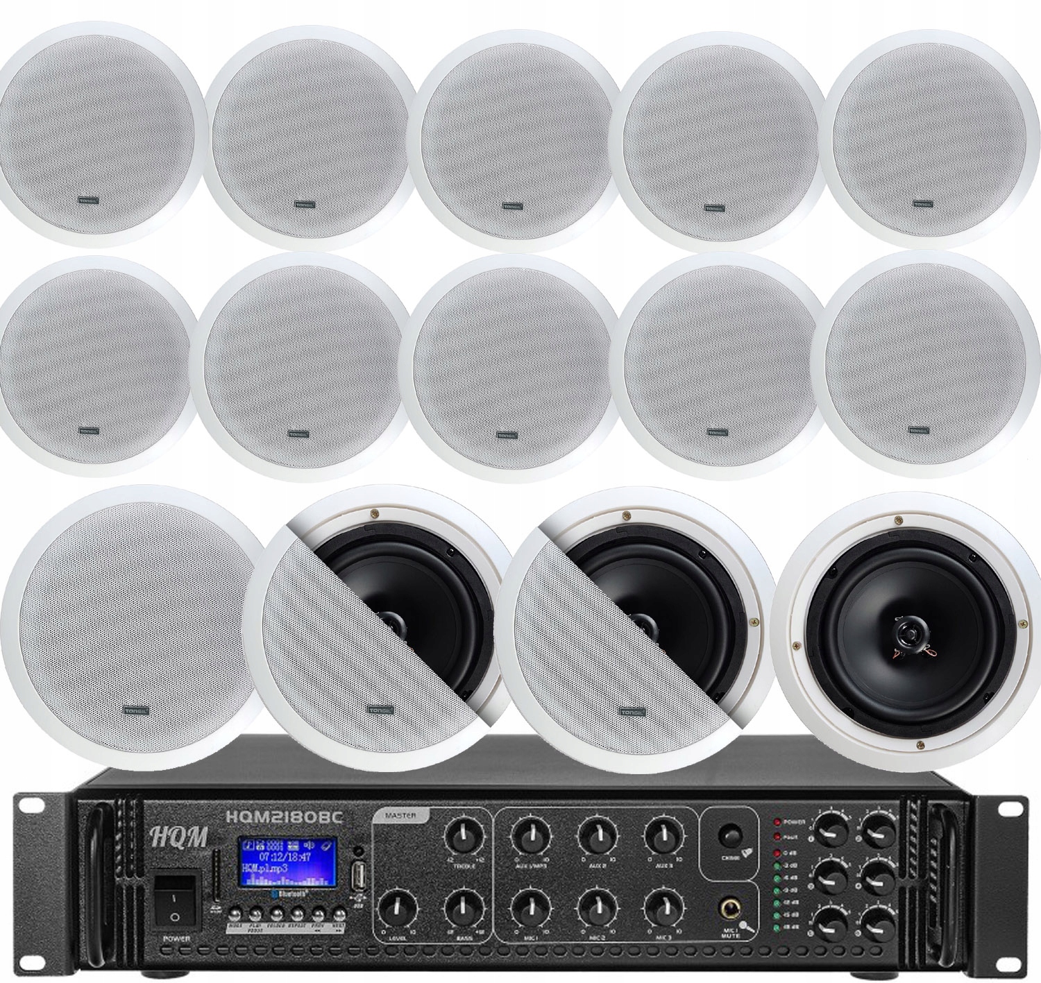 Нижче наведено радіосистему на 100 В із шістьма стельовими динаміками від відомого польського бренду TONSIL білого та білого кольору. підсилювач MP3.